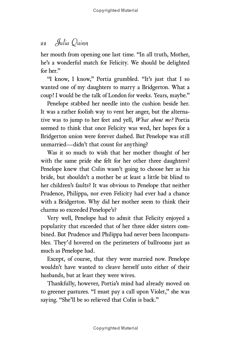 Colin Bridgerton is tired of being thought of as nothing but an empty-headed charmer, tired of the notorious gossip columnist Lady Whistledown, who can’t seem to publish an edition without mentioning him. But when Colin returns to London from a trip abroad, he discovers nothing in his life is quite the same—especially Penelope Featherington! The girl who was always simply there is suddenly the girl haunting his dreams. When he discovers that Penelope has secrets of her own, this elusive bachelor must decide . . . is she his biggest threat— or his promise of a happy ending?