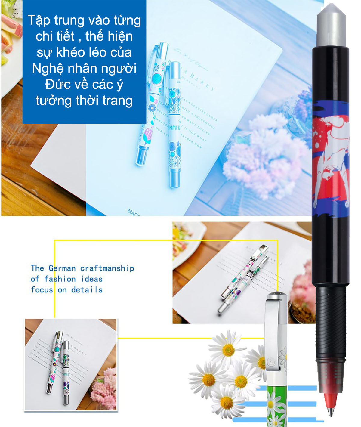 - Màu sắc : Màu xanh - Đặc điểm : + Thiết kế bút nhẹ, vừa tay cầm + Công nghệ mực Free Ink System giúp mực chảy đều, không bị lem mực, tạo nét