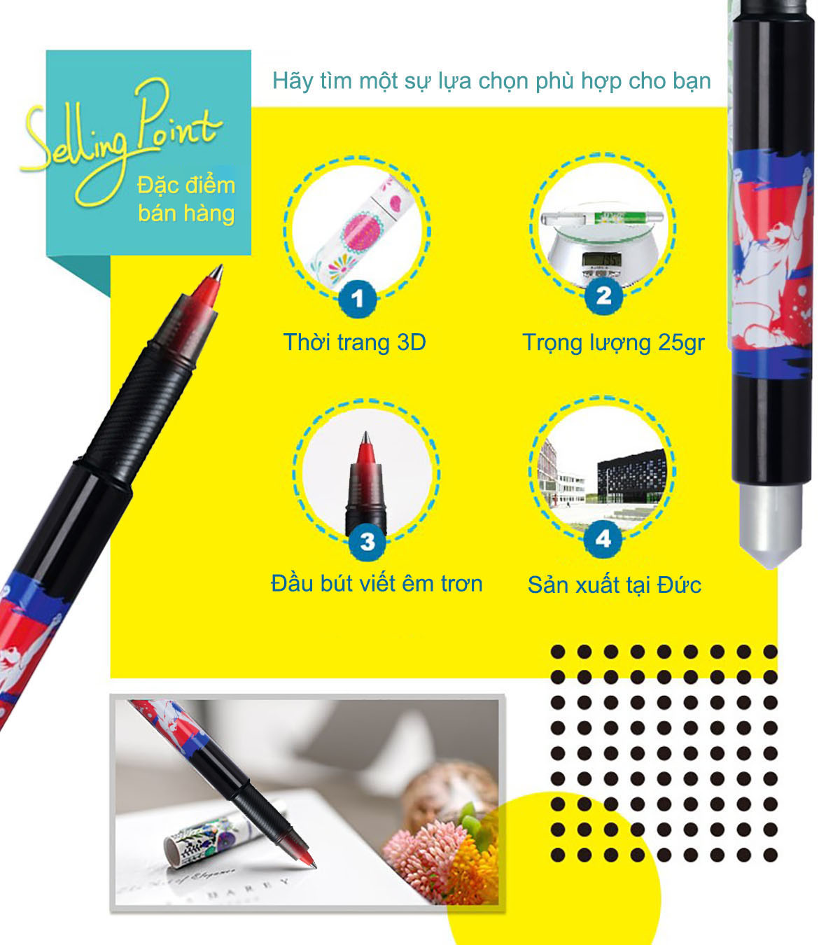 - Màu sắc :Vàng - Đặc điểm : +Thiết kế bút nhẹ, vừa tay cầm + Công nghệ mực Free Ink System giúp mực chảy đều, không bị lem mực, tạo nét viết êm trơn
