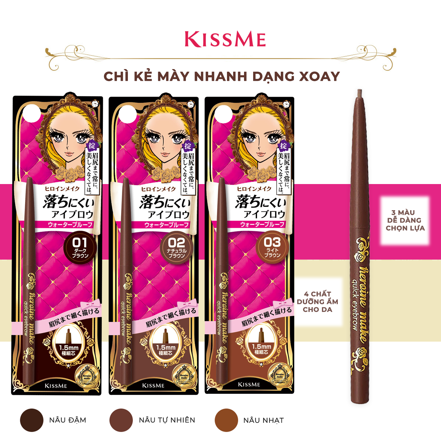 ✨Bút Chì Sáp Kẻ Lông Mày Không Lem Trôi Lõi Siêu Mịn Kissme Heroine Make Quick Eyeliner (3 Màu)