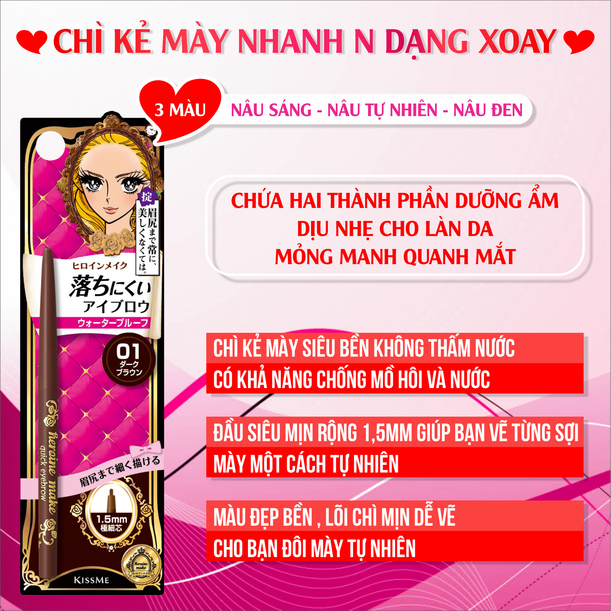 Mua tại TiktokBút Chì Sáp Kẻ Lông Mày Không Lem Trôi Lõi Siêu Mịn Kissme Heroine Make Quick Eyeliner Màu Nâu Đen Thông tin sản phẩm: Số Lô: In trên sản phẩm Thương hiệu: Kissme Xuất Xứ: Nhật Bản Khối lượng tịnh: 0.07g HSD: 5 năm kể từ ngày sản xuất Lõi sáp mịn, siêu bền không thấm nước màu đẹp bền, lõi chì mịn dễ vẽ. Có khả năng chống mồ hôi và nước. Đầu bút siêu mịn, rộng 1,5mm giúp bạn vẽ từng sợi mày một cách tự nhiên 1/ Công dụng:
