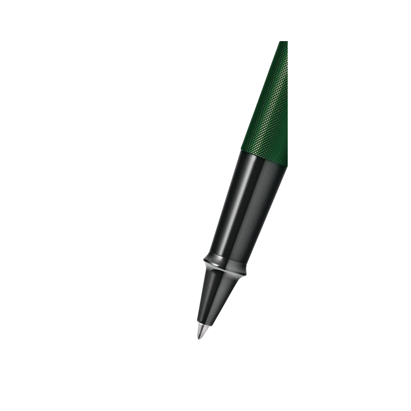 Thân bút được hoàn thiện bằng lớp phủ PVD xanh mờ hiện đại, tạo hiệu ứng bề mặt mịn màng nhờ công nghệ phun cát, kết hợp với họa tiết vi khắc (micro-knurl) tinh xảo, mang lại cảm giác cầm nắm chắc tay và thẩm mỹ độc đáo. Đầu bút được chế tạo theo công nghệ bút bi nước gel độc quyền, cho trải nghiệm viết êm ái, mượt mà như bút máy.