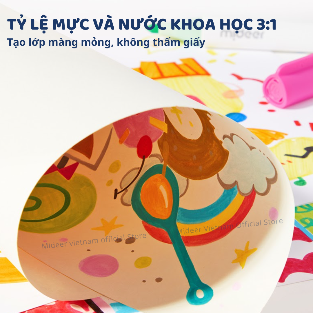 - Mực gốc nước không chứa cồn và an toàn cho trẻ nhỏ- Không có chất phụ gia gây hại, giúp trẻ thoải mái sáng tạo mà không lo ngại về sức khỏe.