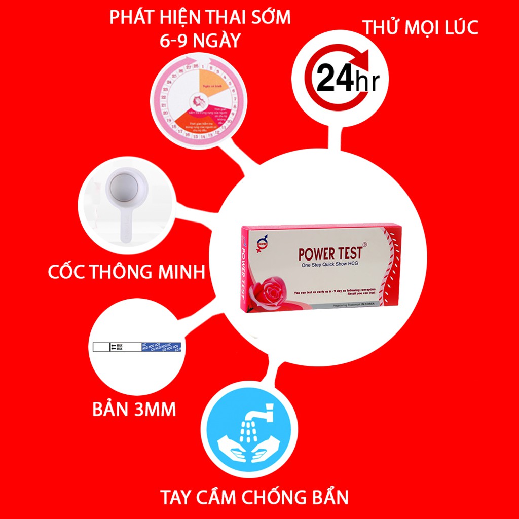 Tên sản phẩm: Que thử thai PowerTest Kích thước test: rộng 5mm Tính năng: Phát hiện thai sớm sau 6 -9 ngày trứng rụng ƯU ĐIỂM: Phát hiện thai sớm sau 6 -9 ngày