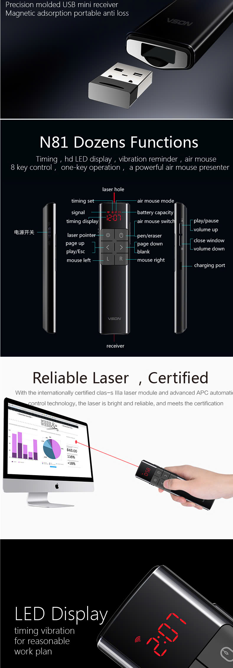 Bút Trình Chiếu Không Dây kiêm Chuột Bay VSON N81 – Tích Hợp Laser & Nhiều Tính Năng Hỗ Trợ Mô tả sản phẩm: Thiết bị trình chiếu đa năng VSON N81 tích hợp cả