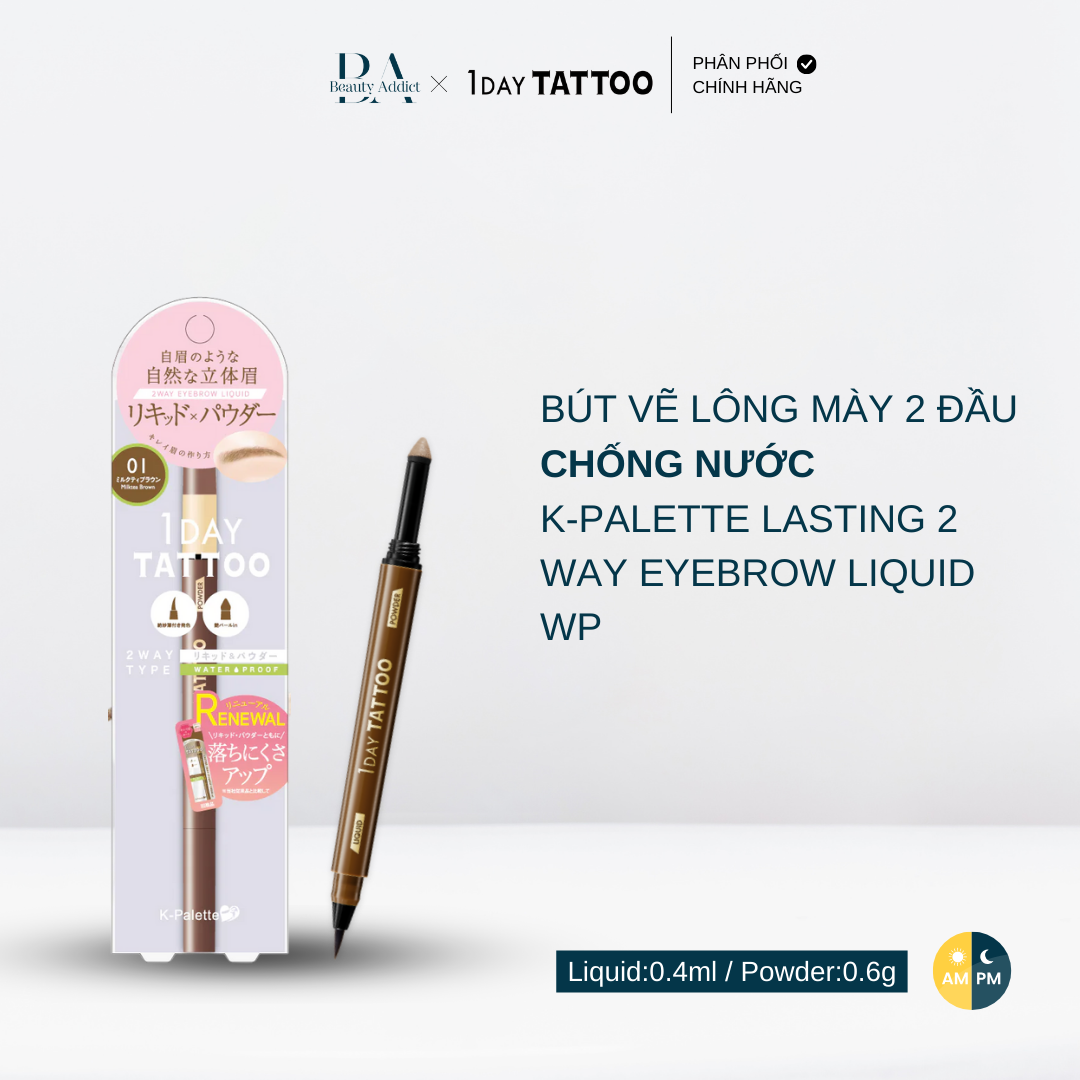 Mua tại TiktokVới thiết kế hiện đại, tiện lợi giúp tạo và giữ dáng mày cực chuẩn, cực dễ dàng cùng khả năng kháng nước, mồ hôi, bã nhờn hiệu quả cho hàng mày sắc nét thật tự nhiên suốt ngày dài. Có 2 đầu : 1 đầu dạng bột ( powder) và 1 đầu dạng nước ( liquid). Giúp chân mày đẹp tự nhiên, rất dễ sử dụng. K-Palette Lasting 2Way Eyebrow bảo đảm không trôi, không lem, bền màu, ra mồ hôi cũng ko sợ lem nha, có khả năng giữ nét vẽ như mới kẻ suốt cả ngày dài. Thành phần dịu nhẹ, an toàn, không gây dị ứng và thích hợp với mọi loại da. Chứa các thành phần dưỡng ẩm như HA, collagen, Hydrolyzed Conchiolin Protein (protein ngọc trai), Trehalose Có 4 màu: