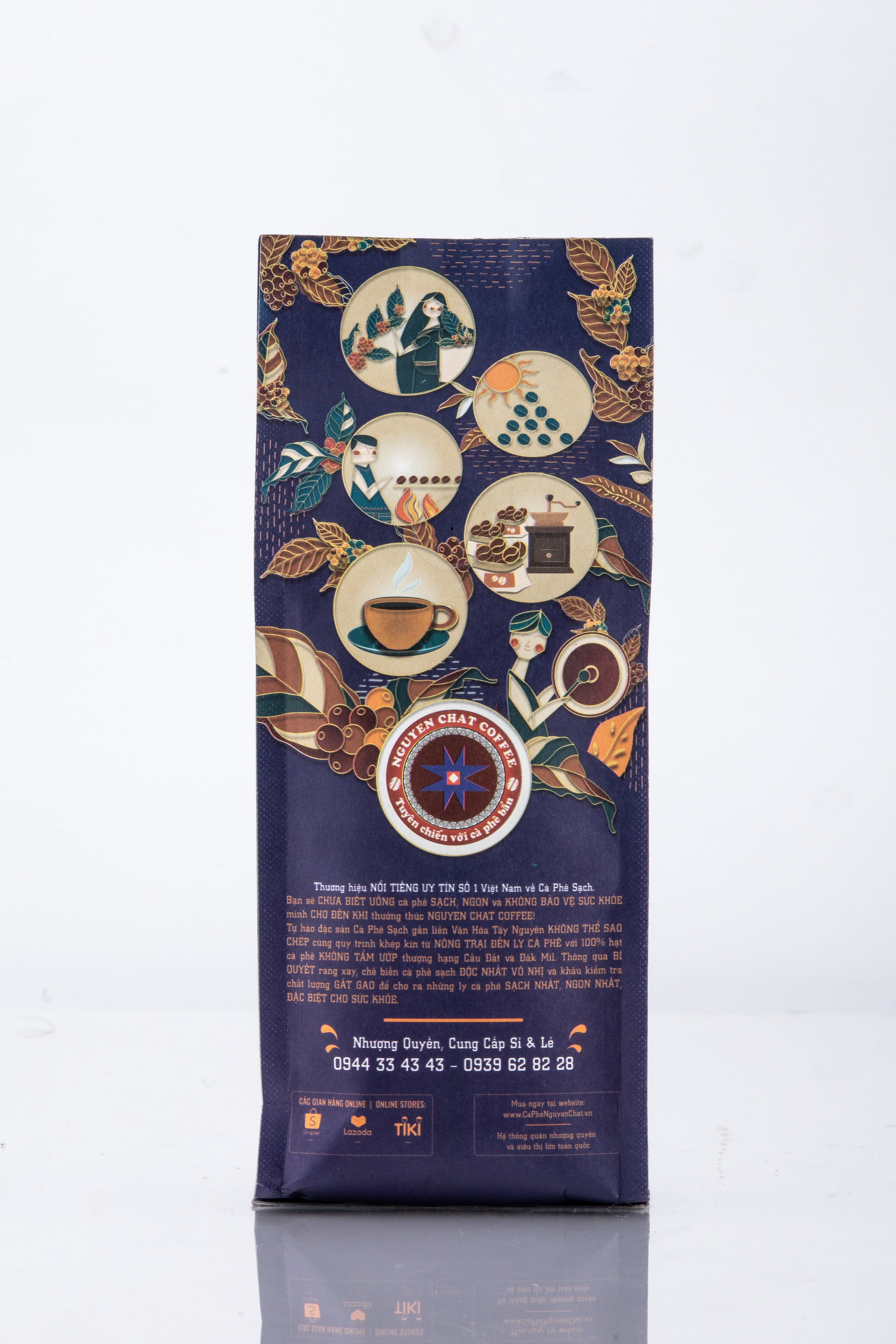 Thành phần / Ingredients: 100% Robusta. Hương vị / Flavor: Đắng đậm, sôcôla, mùi thuốc lá và hậu vị ngọt / Bold, chocolate, cigarette flavor and sweet after-taste. úi 500g / Bag 500gQuy cách / Type: