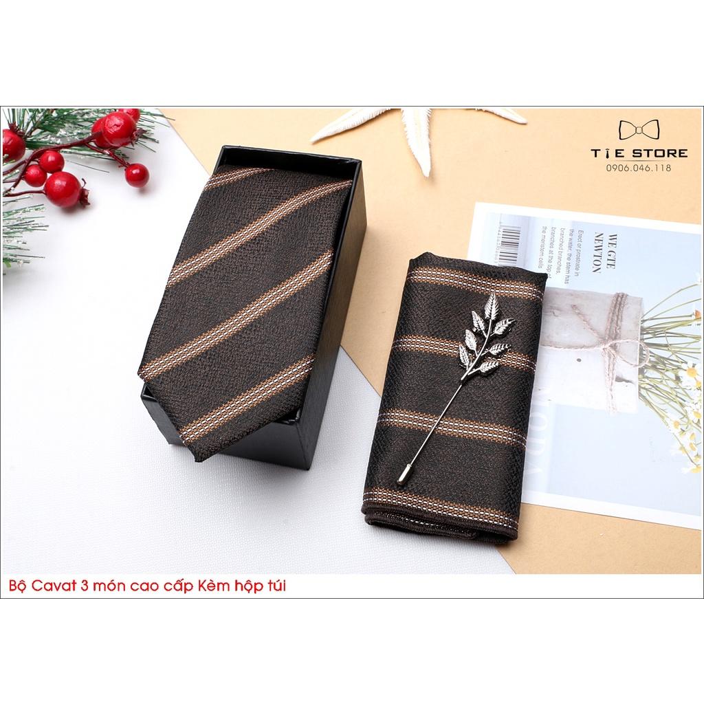 ✨Ca Vat bộ 3 món kèm hộp túi xách cao cấp, quà tặng chú rể, Cavat nâu kẻ