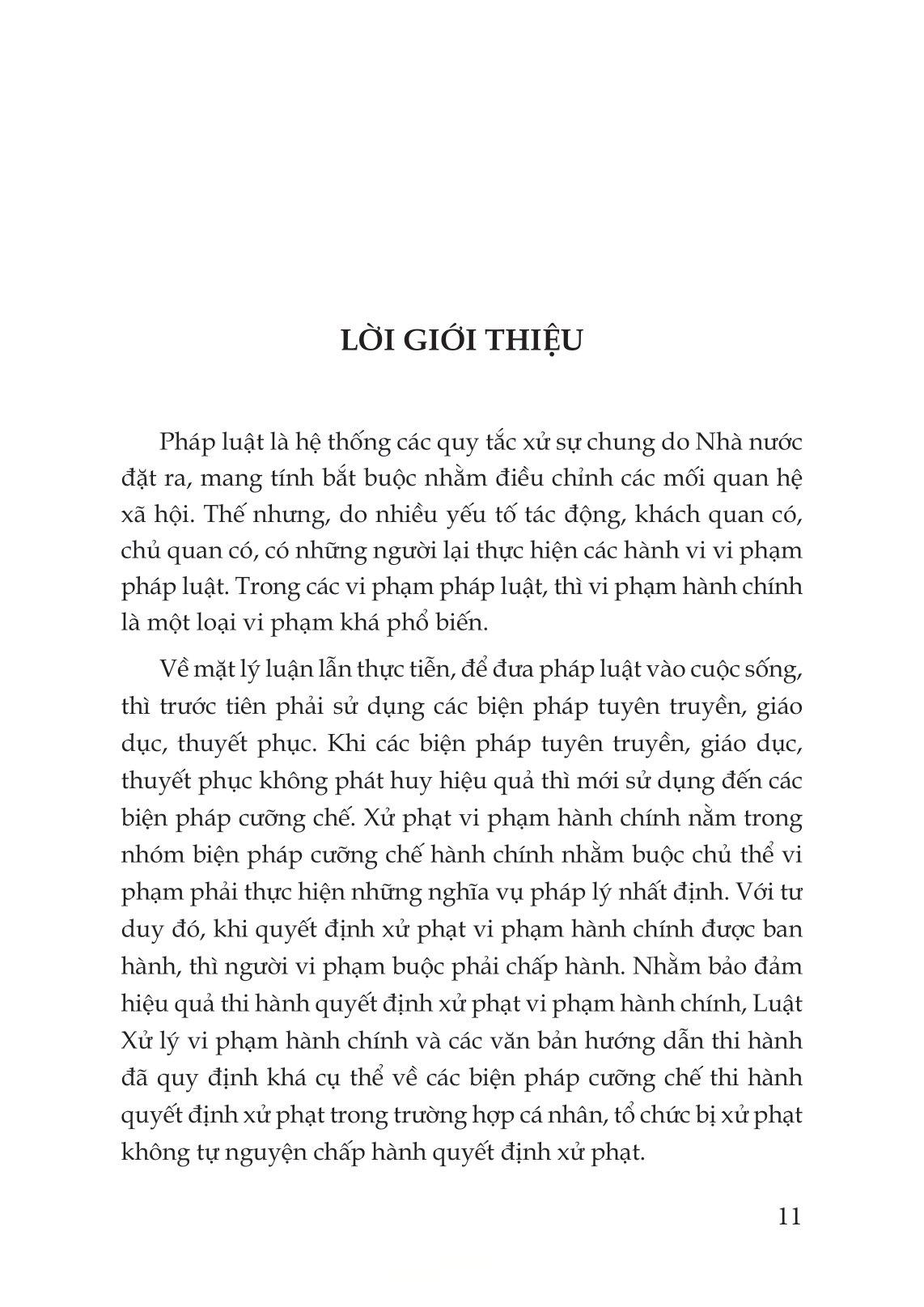 Cuốn sách tập trung phân tích cơ sở lý luận và pháp lý về các biện pháp cưỡng chế thi hành quyết định phạt tiền kết hợp với đánh giá thực trạng pháp luật cũng như thực trạng áp dụng các biện pháp này. Ngoài ra, cuốn sách cũng nêu lên những bất cập của pháp luật khi quy định một số nội dung liên quan (như các trường hợp bị cưỡng chế, thẩm quyền cưỡng chế, xử lý vi phạm liên quan đến việc áp dụng các biện pháp cưỡng chế, sự chồng chéo về số lượng cũng như nguyên tắc áp dụng các biện pháp cưỡng chế và những vấn đề khó khăn, trở ngại trong quá trình áp dụng từng biện pháp cưỡng chế cụ thể), từ đó đề xuất các giải pháp để hoàn thiện pháp luật về các biện pháp cưỡng chế thi hành phạt tiền trong xử phạt vi phạm hành chính.