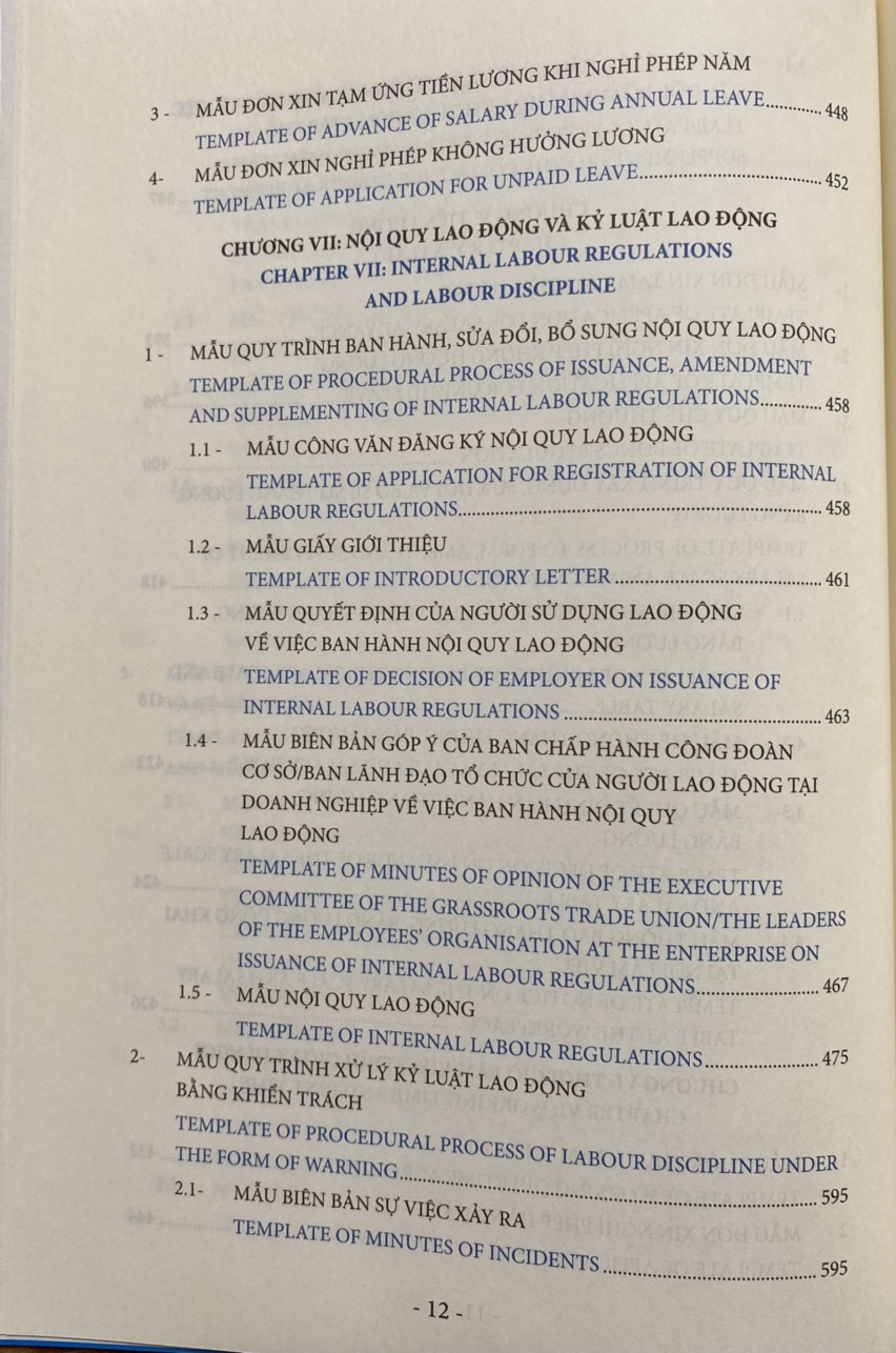 Các biểu mẫu nhân sự về pháp luật lao động được trình bày dưới dạng song ngữ Việt Anh giúp độc giả thuận tiện tham chiếu và áp dụng phù hợp.