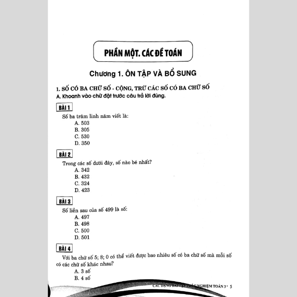 Các đề Toán trong cuốn sách này thuộc một số loại trắc nghiệm phổ biến: đúng - sai; điền vào chỗ thiếu; ghép nối; nhiều lựa chọn (thường là bốn lựa chọn)... Để phù hợp với thời gian làm từng câu khi thi trắc nghiệm, đa phần các đề Toán khá dễ. Làm các đề bài trong cuốn Các dạng bài tập trắc nghiệm Toán 3 giúp học sinh củng cố những phần kiến thức lý thuyết được học trong giờ Toán trên lớp. Với mục đích đó, các em nên giải bài tập trong cuốn sách này theo cách hơi khác khi làm bài thi, nhất là với dạng trắc nghiệm bốn lựa chọn. Các em nên tự giải bài tập, rồi so kết quả với các lựa chọn đề bài đưa ra để khoanh tròn phương án đúng. Cách làm này tuy có lâu hơn, nhưng nó phát huy được khả năng tư duy của người học.
