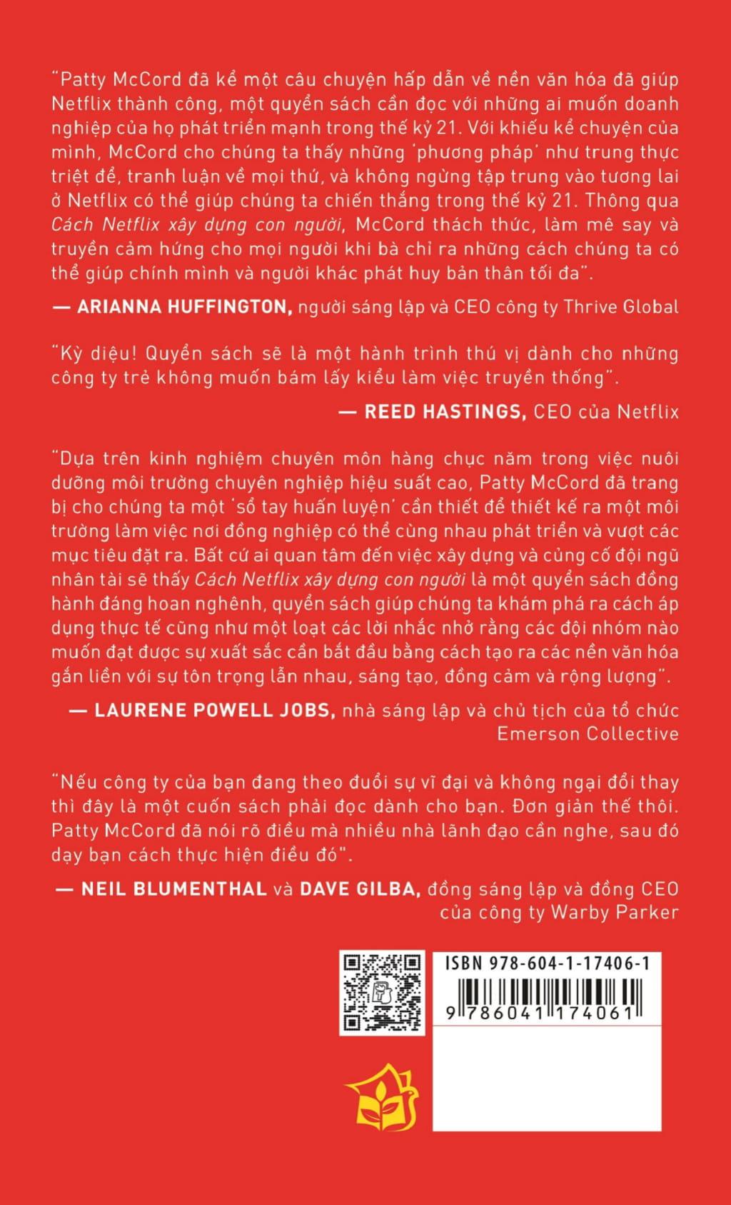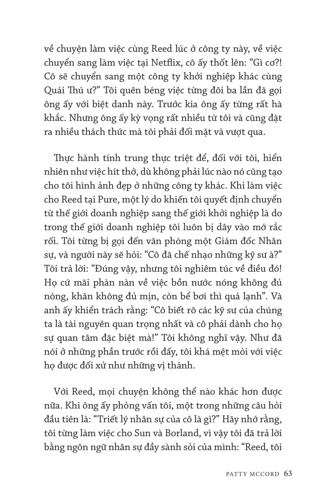 ộc giả sẽ cùng tìm hiểu xem làm thế nào để đề cao tính trung thực triệt để trong môi trường công sở, thúc đẩy sự tranh luận sôi nổi của mọi người và hướng tất cả liên tục tập trung vào tương lai ra sao để đưa doanh nghiệp đi tới thành công. Không chỉ là tìm người phù hợp với từng vị trí, các vấn đề nhạy cảm như lương thưởng cũng như cho thôi việc, chuyển việc cũng được xem xét tới. Đây là một cuốn sách đáng đọc cho những người muốn tìm hiểu về thành công của Netflix cũng như muốn xây dựng được một văn hóa doanh nghiệp phù hợp với tầm nhìn của mình.