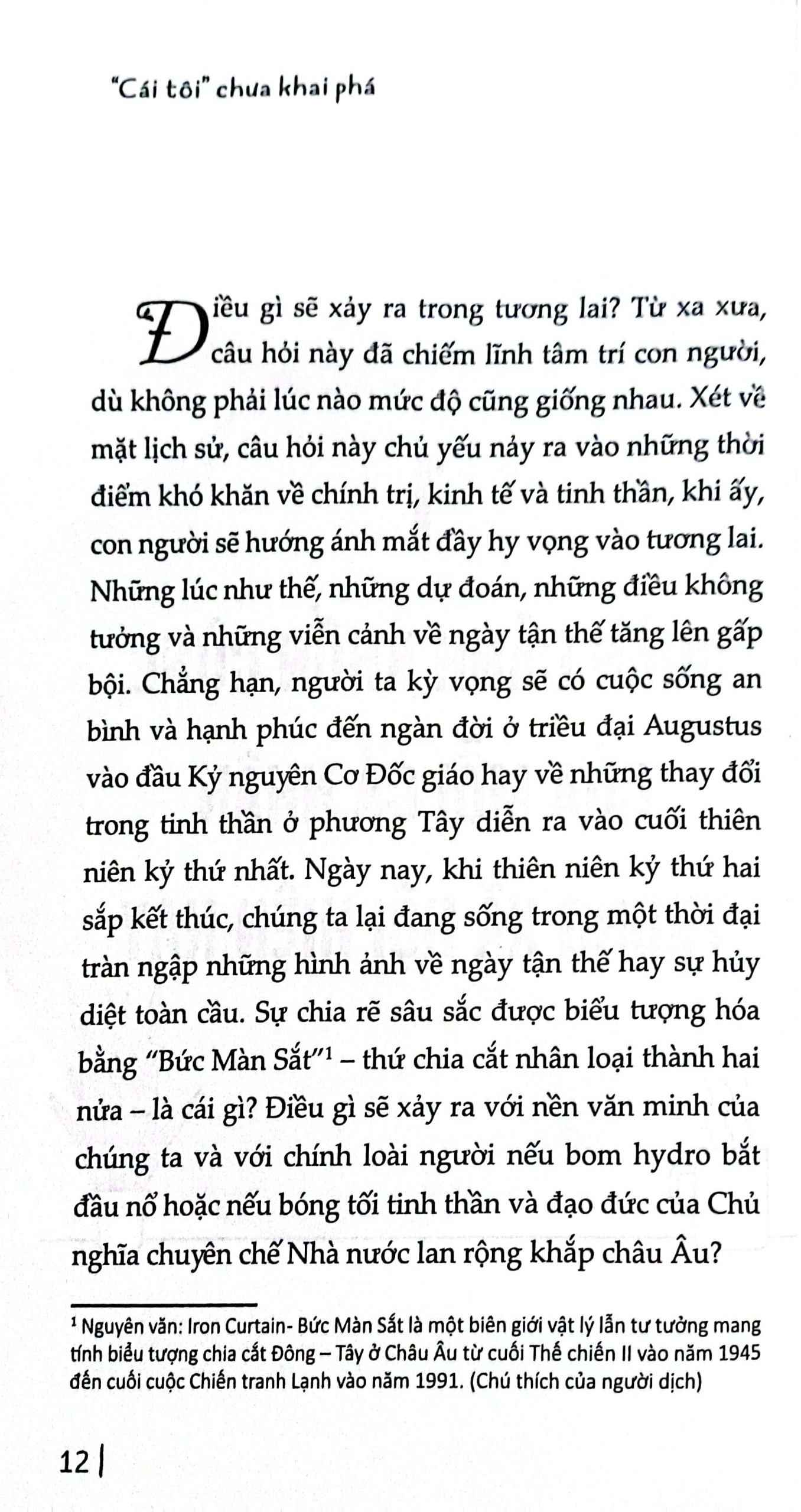 Cái Tôi Chưa Khai Phá THÔNG TIN TÁC GIẢ: Carl Jung là một trong những nhân vật quan trọng trong lịch sử của Tâm lý học và Phân tâm học. Ông được biết đến với những đóng góp quan trọng vào việc tìm hiểu về tâm lý của con người và phát triển những lý thuyết độc đáo. Jung cũng quan tâm đến tôn giáo, tôn vinh vai trò của tâm hồn và thế giới tinh thần trong đời sống của con người. Công trình của ông đã ảnh hưởng đến nhiều lĩnh vực, từ Tâm lý học đến nghệ thuật và triết học, và ông được coi là một trong những tư duy lớn của thế kỷ XX. TÓM TẮT NỘI DUNG: Có một sự thật là con người mong manh hơn những gì chúng ta tưởng: dễ bị thao túng, đồng hóa và ràng buộc bởi những định nghĩa của xã hội. Thế nhưn đó chưa phải là “cái tôi” thực sự. Cái Tôi Chưa Khai Phá là một cuốn sách nhỏ của Carl Jung, thông qua những bài luận của mình, Carl Jung đã đưa ra những luận giải về tác động của tâm lý đám đông, các tôn giáo cũng như cơ chế quyền lực đối với từng cá nhân; và từ đó cho thấy “cái tôi” được định nghĩa bởi các yếu tố bên ngoài nhiều đến thế nào. Hơn tất cả, dù là ta ở thời đại nào, độc lập tư duy luôn đóng một vai trò then chốt nhằm phát triển cá nhân như các mà chính Carl Jung nói, là đơn vị nguyên tử của xã hội.