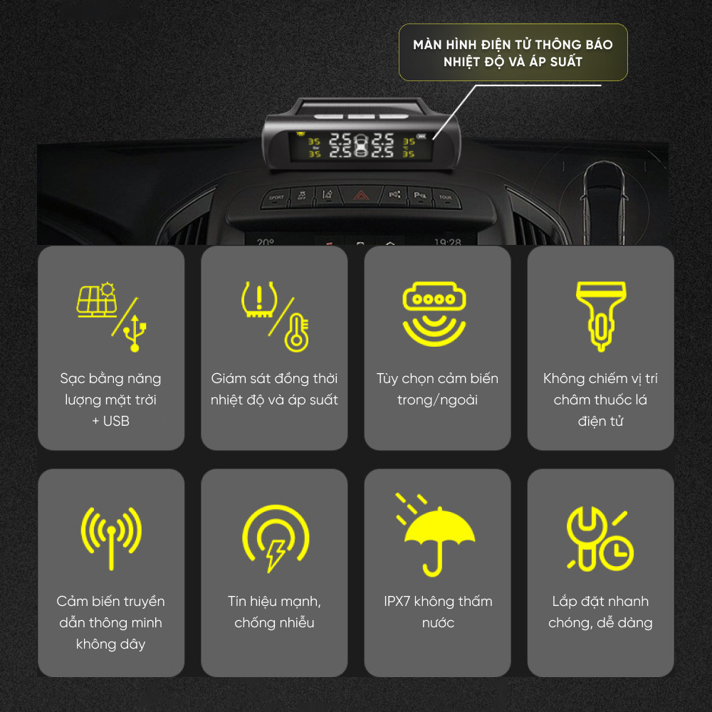 Kiểm soát các vấn đề về lốp luôn được người sử dụng ô tô quan tâm hàng đầu. Còn gì tuyệt vời hơn khi bạn chỉ việc ngồi trong xe mà vẫn hoàn toàn có thể kiểm soát được áp suất và nhiệt độ từng lốp xe của mình mà không phải trực tiếp ra ngoài tận mắt kiểm tra nữa! Được sản xuất trên công nghệ tiên tiến nhất , Cảm biến áp suất lốp ô tô TPMS màn hình led màu thông minh theo dõi từng thay đổi nhỏ nhất của nhiệt độ và áp suất lốp, có cảnh báo bằng âm thanh và hình ảnh tới bạn mỗi khi áp suất lốp quá thấp 3,3 Bar hoặc nhiệt độ lốp > 70 độ C.