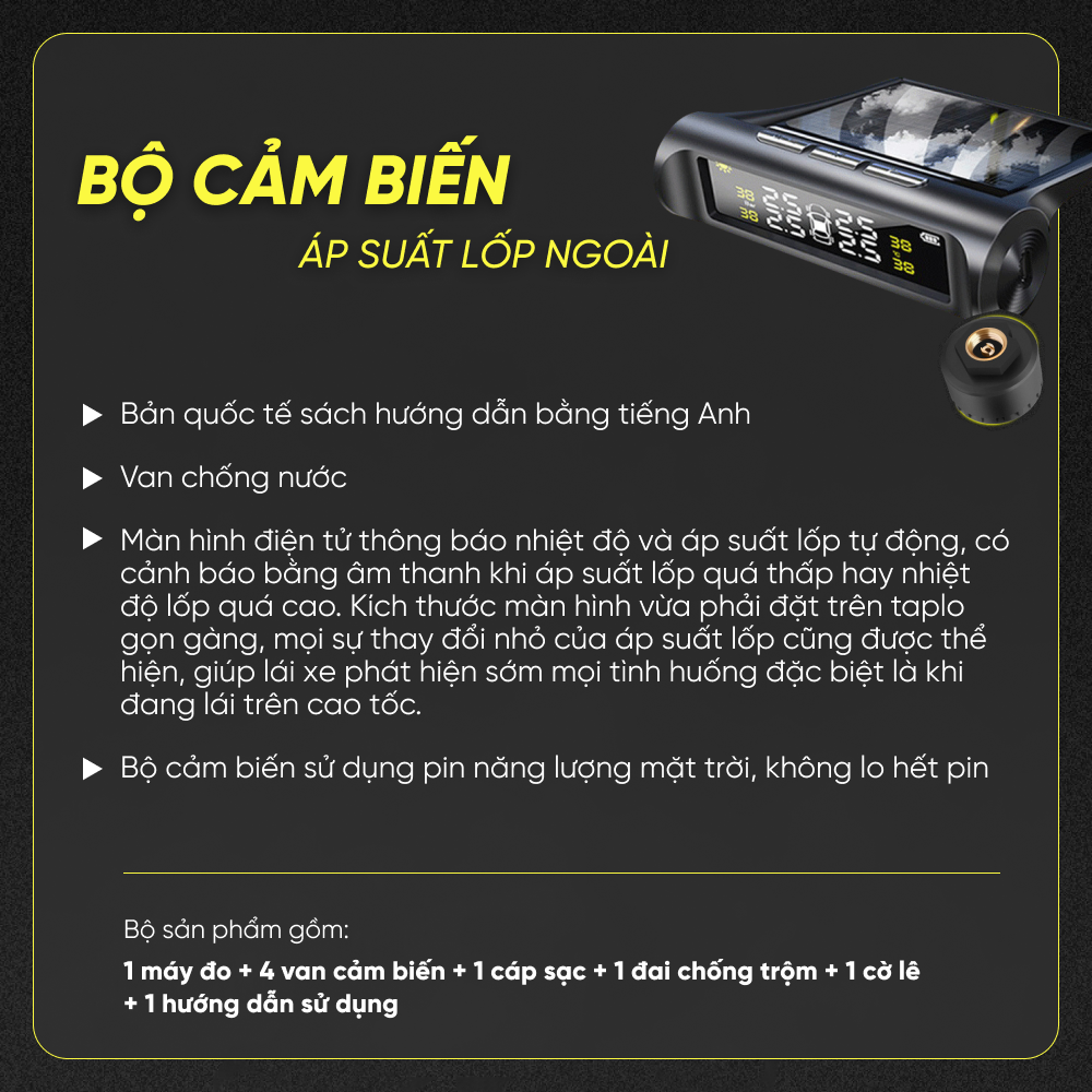 1. Thông tin chi tiết sản phẩm cảm biến áp suất – Tên chi tiết sản phẩm: Cảm biến áp suất lốp xe hơi TPMS cao cấp thế hệ mới – không dây – chống