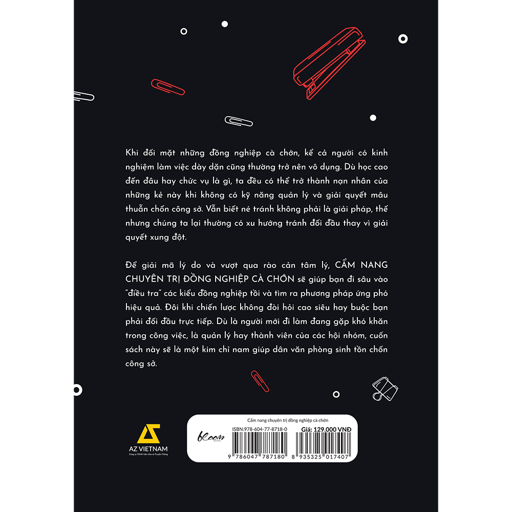 Để giải mã lý do và vượt qua rào cản tâm lý, CẨM NANG CHUYÊN TRỊ ĐỒNG NGHIỆP CÀ CHỚN sẽ giúp bạn đi sâu vào “điều tra” các kiểu đồng nghiệp tồi và tìm ra phương pháp ứng phó hiệu quả. Đôi khi chiến lược không đòi hỏi cao siêu hay buộc bạn phải đối đầu trực tiếp. Dù là người mới đi làm đang gặp khó khăn trong công việc, là quản lý hay thành viên của các hội nhóm, cuốn sách này sẽ là một kim chỉ nam giúp dân văn phòng sinh tồn chốn công sở.