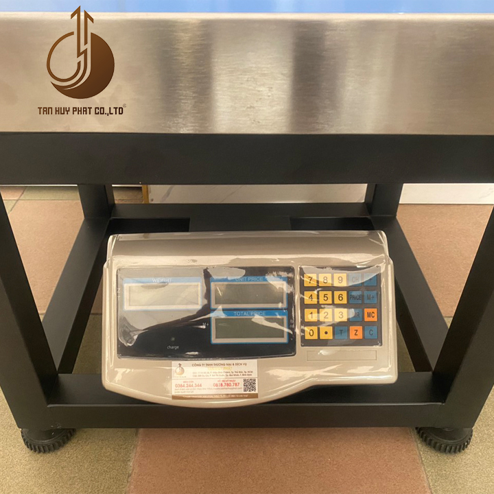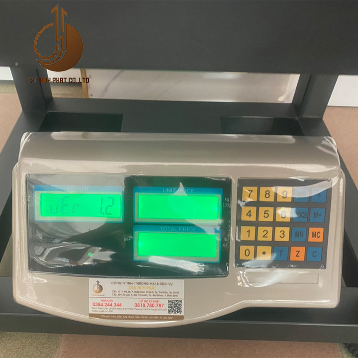 Hiển thị: Màn hình LCD 6 số đen nền xanh. Hiển thị: Khối lượng, Đơn giá, Thành tiền.