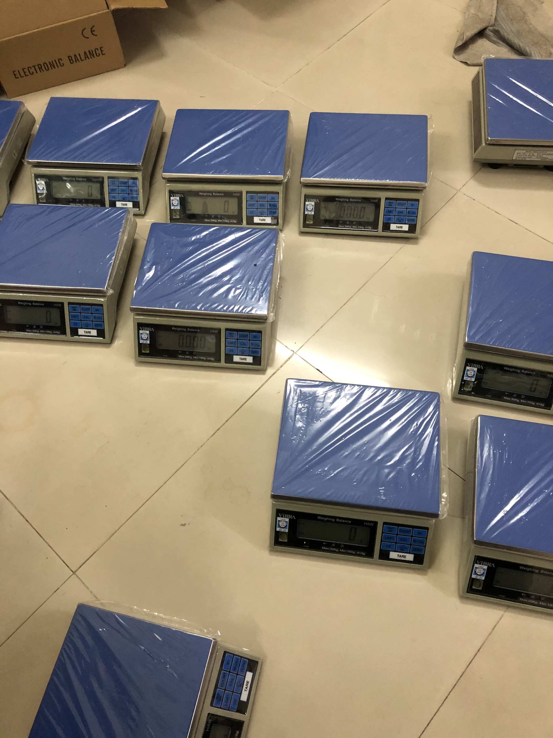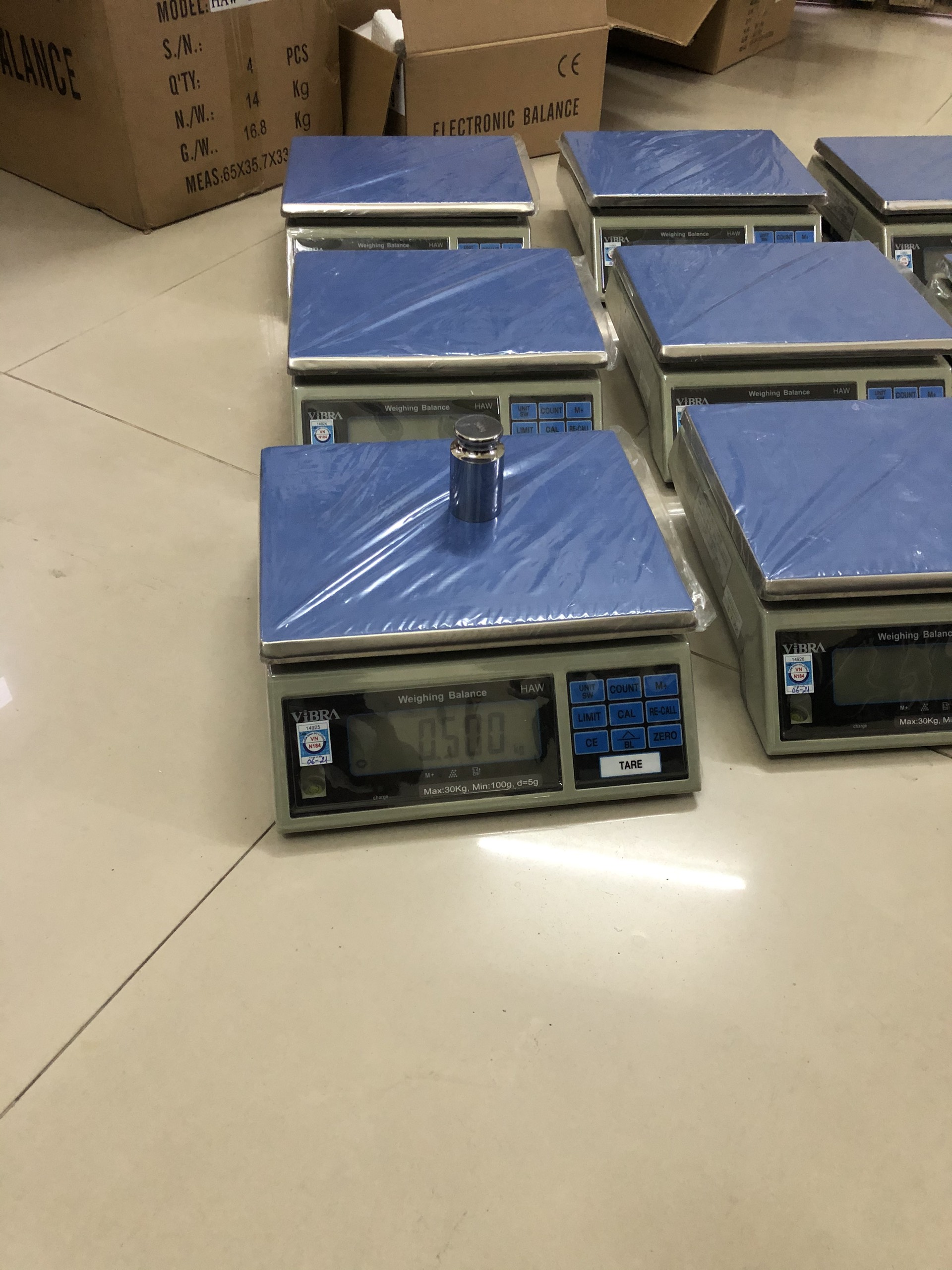 Cân Điện Tử VIBRA HAW Cân Điện Tử VIBRA HAW 30KG Cân Điện Tử VIBRA HAW 15KG Cân Điện Tử VIBRA HAW 6KG Cân Điện Tử VIBRA HAW 3KG 1.TÍNH NĂNG CÂN ĐIỆN TỬ HAW   – Mức cân : 3 kg, 6kg, 15kg, 30kg. – Giá trị độ chia kiểm: 0.1g, 0.2g, 0.5g, 1g. – Kích thước đĩa : 290 x 230 (mm) – Kích thước cân : 270 x 310 x 100 (mm) – Màn hình hiển thị LED 6 số đỏ dể đọc ở mọi góc nhìn – Chức năng tự kiểm tra pin, báo pin sắp hết    2.CÁC TÍNH NĂNG TỔNG QUÁT   – Khung cân nhựa ABS màu xám, đĩa cân inox chống ăn mòn. – Chân đế có thể di chuyển mọi địa hình, thiết kế vững chắc – Sử dụng trong ngành sản xuất, chế tạo, vận chuyển, văn phòng – Chính xác cao ( độ phân giải bên trong) (1/30.000,1/60.000) – Màn hình hiển thị LCD nền sáng xanh dễ đọc. – Chức năng tự kiểm tra pin. Tự động sáng đèn , tự động tắt nguồn. – Cổng giao tiếp RS-232( Lựa chọn). – Màn hình hiển thị bằng trục đứng, phím chuyển đổi đơn vị kg/lb/Pcs/g – Thiết bị đạt độ chính xác cấp III theo tiêu chuẩn OIML. – Thiết kế chống bụi, cũng như sự ảnh hưởng của môi trường. – Chức năng: Cân kiểm tra trọng lượng, trừ bì, đếm Pcs,cộng dồn, cảnh báo Hi Lo Ok.. – Nguồn : 220v/50Hz kèm theo pin sạc 6v/4.5ah