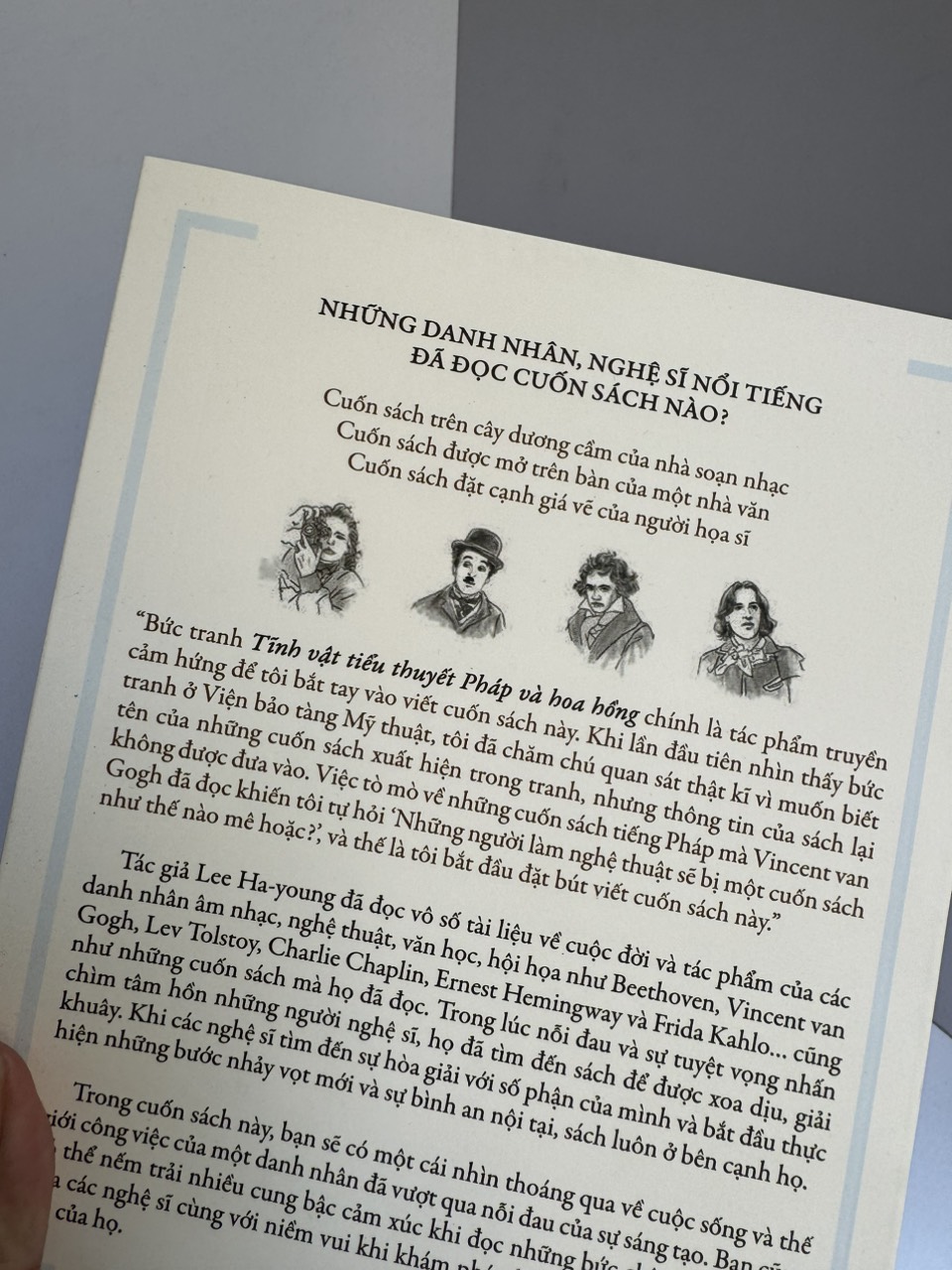 Trong hành trình thú vị này, Lee Ha-young đã đọc vô số tài liệu về cuộc đời và tác phẩm của các nghệ sĩ âm nhạc, nghệ thuật, văn học, nhiếp ảnh như Beethoven, Vincent van Gogh, Lev Tolstoy, Charlie Chaplin, Ernest Hemingway và Frida Kahlo… cũng như những cuốn sách mà họ đã đọc.
