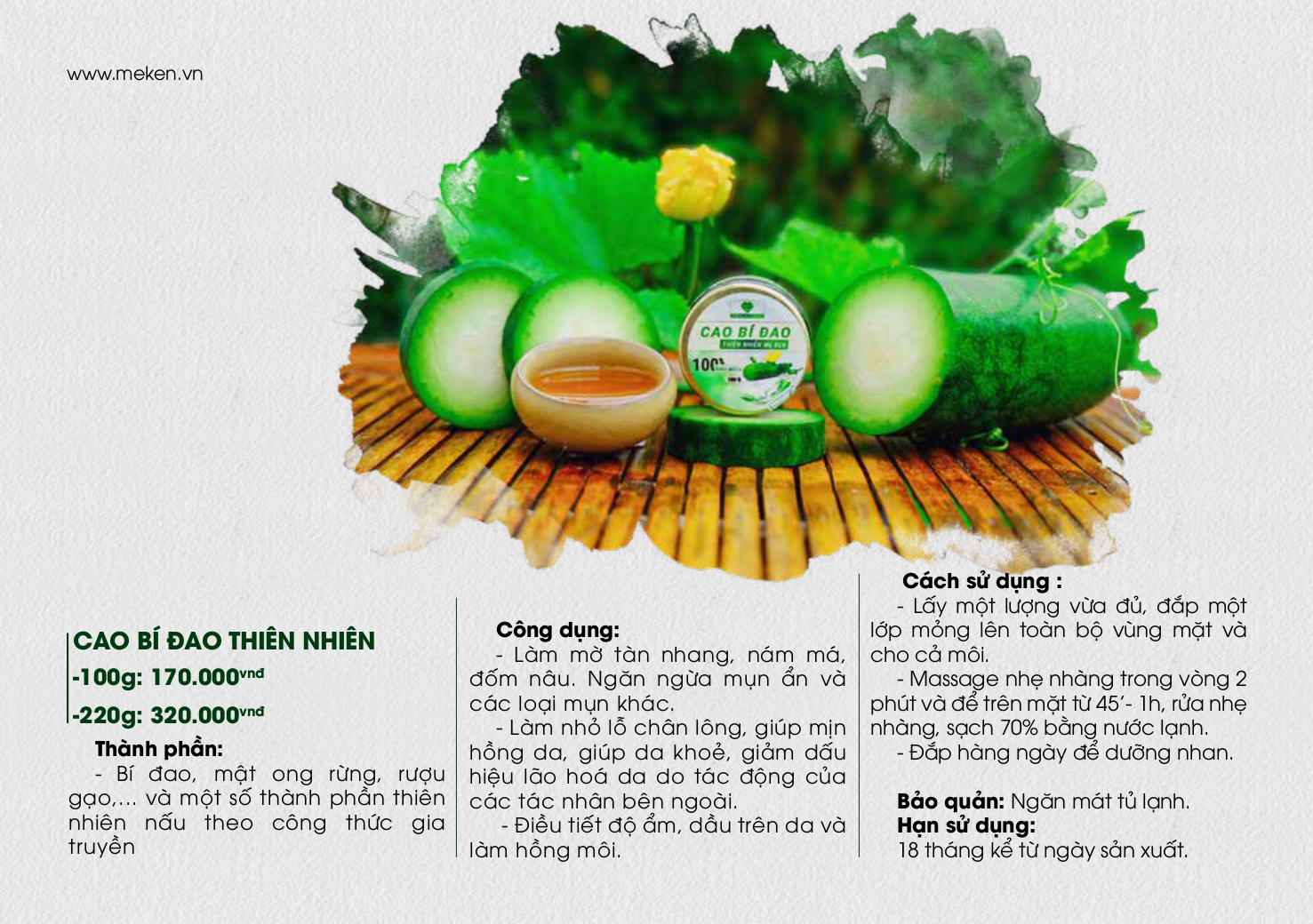 Mua tại TiktokCAO BÍ ĐAO MẸ KEN THIÊN NHIÊN MẸ KEN (100g) THÀNH PHẦN: Bí đao, mật ong rừng, rượu gạo, … và một số thành phần thiên nhiên nấu theo công thức gia truyền. -Vì là thành phần hoàn toàn từ thiên nhiên có thể ăn được, dùng cho phụ nữ có thai và cho con bú cực kỳ an toàn, nên hoàn toàn ko kích ứng, không phụ thuộc, không bắt nắng, dùng để dưỡng nhan. CÔNG DỤNG: Là một bài thuốc dưỡng nhan tuyệt vời của Lương Y Tuệ Tĩnh.