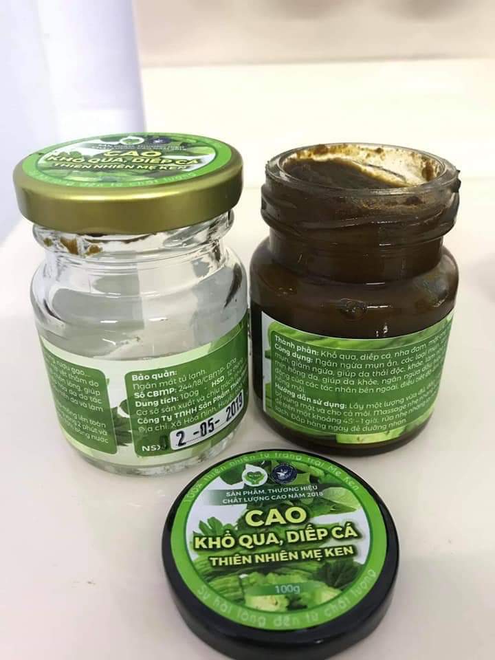CAO BÍ ĐAO MẸ KEN THIÊN NHIÊN MẸ KEN (100g)   THÀNH PHẦN: Bí đao, mật ong rừng, rượuu gạo, … và một số thành phần thiên nhiên nấu theo công thức gia truyền Vì là thành phần thiên nhiên hoàn toàn nên hoàn toàn ko kích ứng, không phụ thuộc, không bắt nắng. CÔNG DỤNG: Làm mờ tàn nhang, nám má, đốm nâu, ngăn ngừa mụn ẩn, các loại mụn, làm nhỏ lỗ chân lông. Giúp mịn hồng da, giúp da khỏe, giảm dấu hiệu lão hóa da do tác động của các tác nhân bên ngoài, điều tiết độ ẩm, dầu trên da và làm hồng môi. HƯỚNG DẪN SỬ DỤNG: Lấy một lượng vừa đủ, đắp 1 lớp mỏng lên toàn bộ vùng mặt và cho cả môi, massage nhẹ nhàng trong vòng 2 phút và để trên mặt từ 45’ – 1h. Rửa nhẹ nhàng lại, sạch 70% bằng nước lạnh. Đắp hàng ngày để dưỡng nhan.    BẢO QUẢN:  ngăn mát tủ lạnh. HẠN DÙNG: 12 tháng kể từ ngày sản xuất     CAO KHỔ QUA DIẾP CÁ MẸ KEN 100gr   THÀNH PHẦN : khổ qua, diếp cá, mật ong rừng, nha đam, rượuu gạo nguyên chấ   *CÔNG DỤNG : - Làm giảm da mụn mủ, mụn đỏ, viêm da, các loại mụn, thải độc da, kháng viêm, làm trắng da, dịu da bỏng nắng, làm giảm thâm hiệu quả