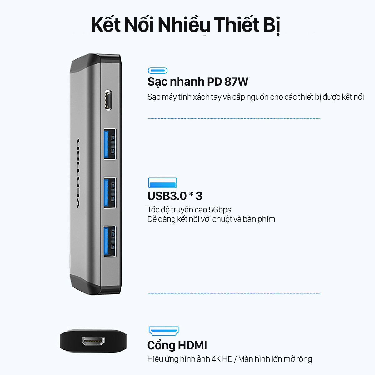 ✨Cáp chuyển đổi Type-C sang HDMI + 3 cổng USB 3.0 + Type-C PD Vention CNBHB - hàng chính hãng