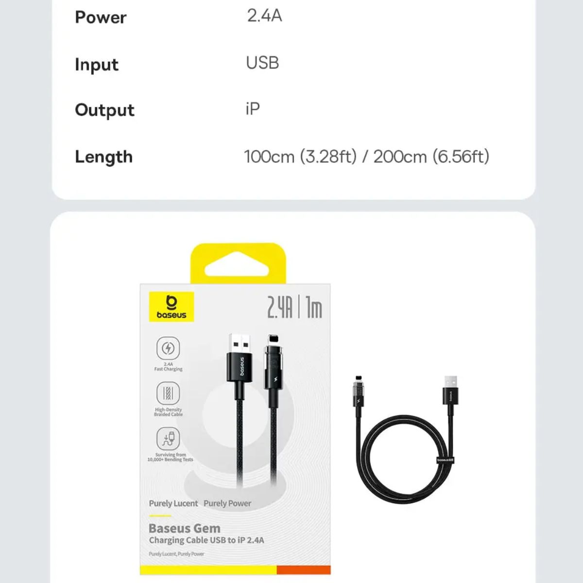 - Một trong những điểm nổi bật của cáp sạc Baseus Gem là khả năng sạc nhanh với dòng điện lên đến 2.4A. Với tốc độ này, người dùng có thể sạc thiết bị của mình nhanh chóng, tiết kiệm thời gian.