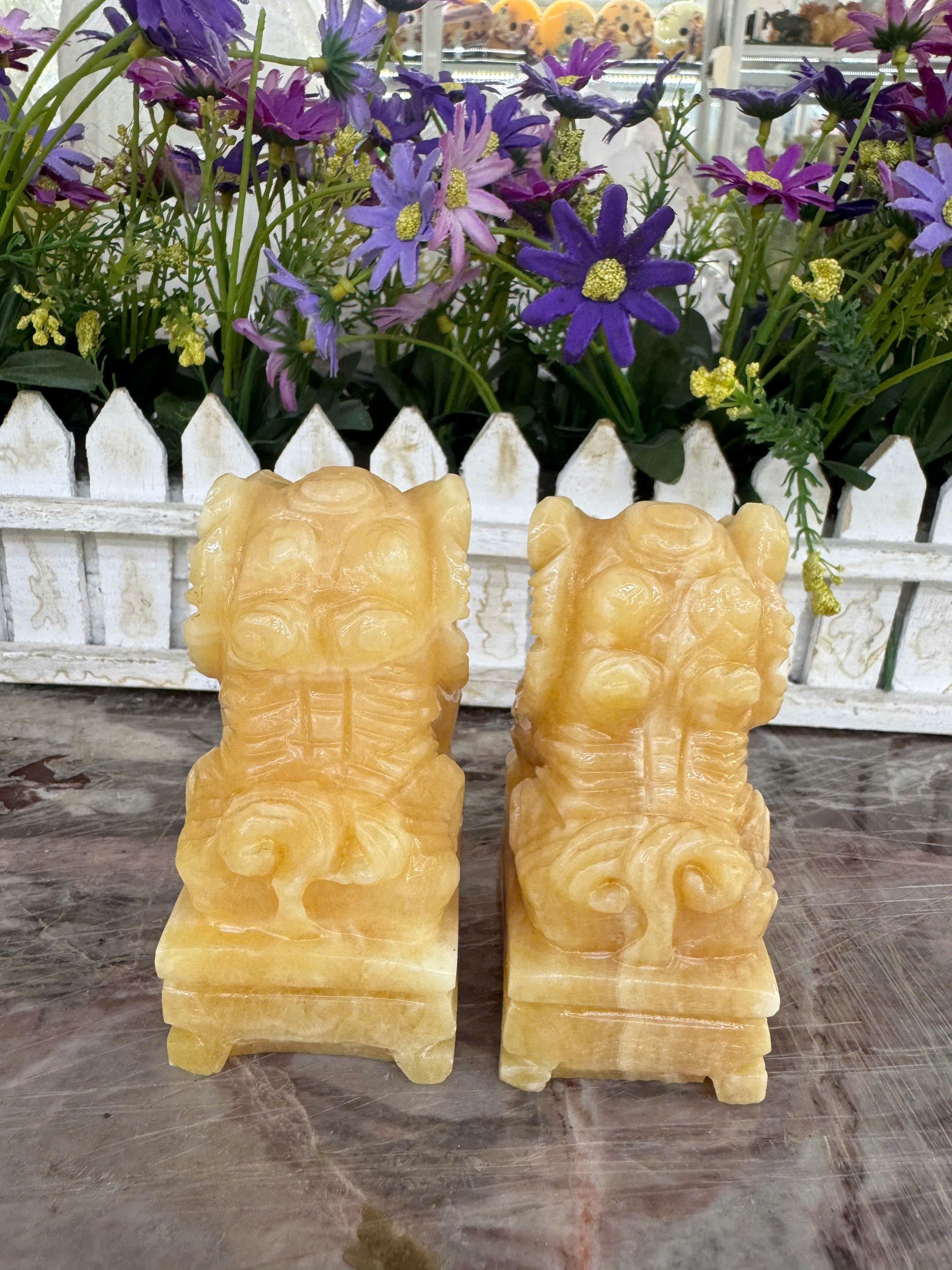 Hợp mệnh Thổ - Kim Chất liệu: Đá cẩm thạch vàng cà rốt Kích thước: Dài 15 cm X Rộng 6 cm x Cao 12,5 cm Khối lượng: 3,2 kg / cặp Ý nghĩa Tỳ