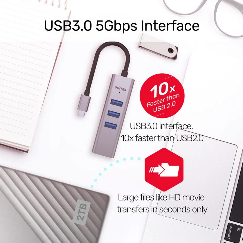 ✨CÁP TYPE-C -> 3 USB 3.0 + LAN UNITEK H1904A - HÀNG CHÍNH HÃNG