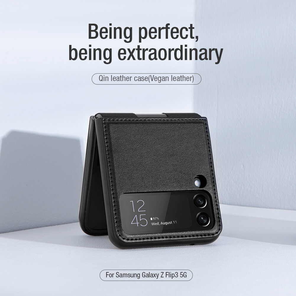 Case bao da chống sốc cho Samsung Galaxy Z Flip 3 trang bị chân chống giá đỡ điện thoại hiệu Nillkin Qin Vegan (bảo vệ máy cực tốt, chất liệu da thật cao cấp, thiết kế thời trang cá tính)