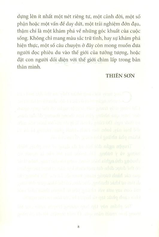 “Tác phẩm này tập hợp những truyện ngắn của tôi trong hơn mười năm qua. Ở mỗi truyện tôi đã cố gắng dựng lên ít nhất một nét riêng tư, một cảnh đời, một số phận hoặc một vấn đề day dứt, một trải nghiệm đớn đau, thậm chí là một khám phá về những khóc khuất của cuộc sống. Không chỉ mang màu sắc trữ tình, hay sự khám phá hiện thực, một số câu chuyện ở đây còn mong muốn đưa người đọc phiêu du vào thế giới của tưởng tượng, của liên tưởng xa xăm hoặc đặt con người đối diện với thế giới chìm lấp trong bản thân mình.”