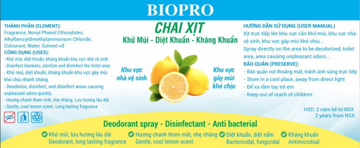 Chai xịt Biopro khử mùi diệt khuẩn kháng khuẩn Khu vực gây mùi khó chịu Khu vực nhà vệ sinh Hương chanh thơm mát dịu nhẹ => Shop xin cam kết Hạn sử dụng của