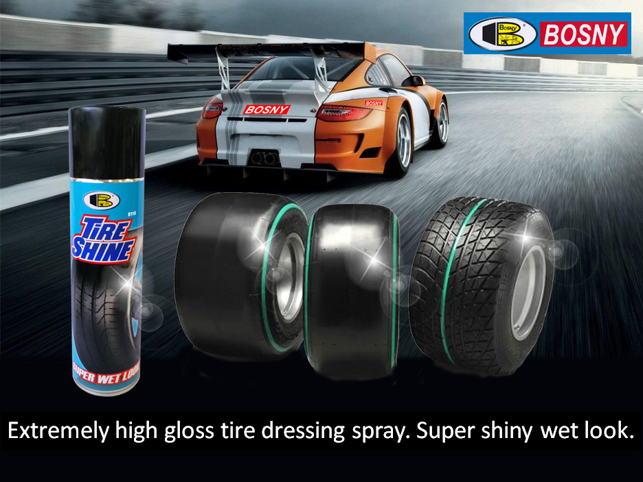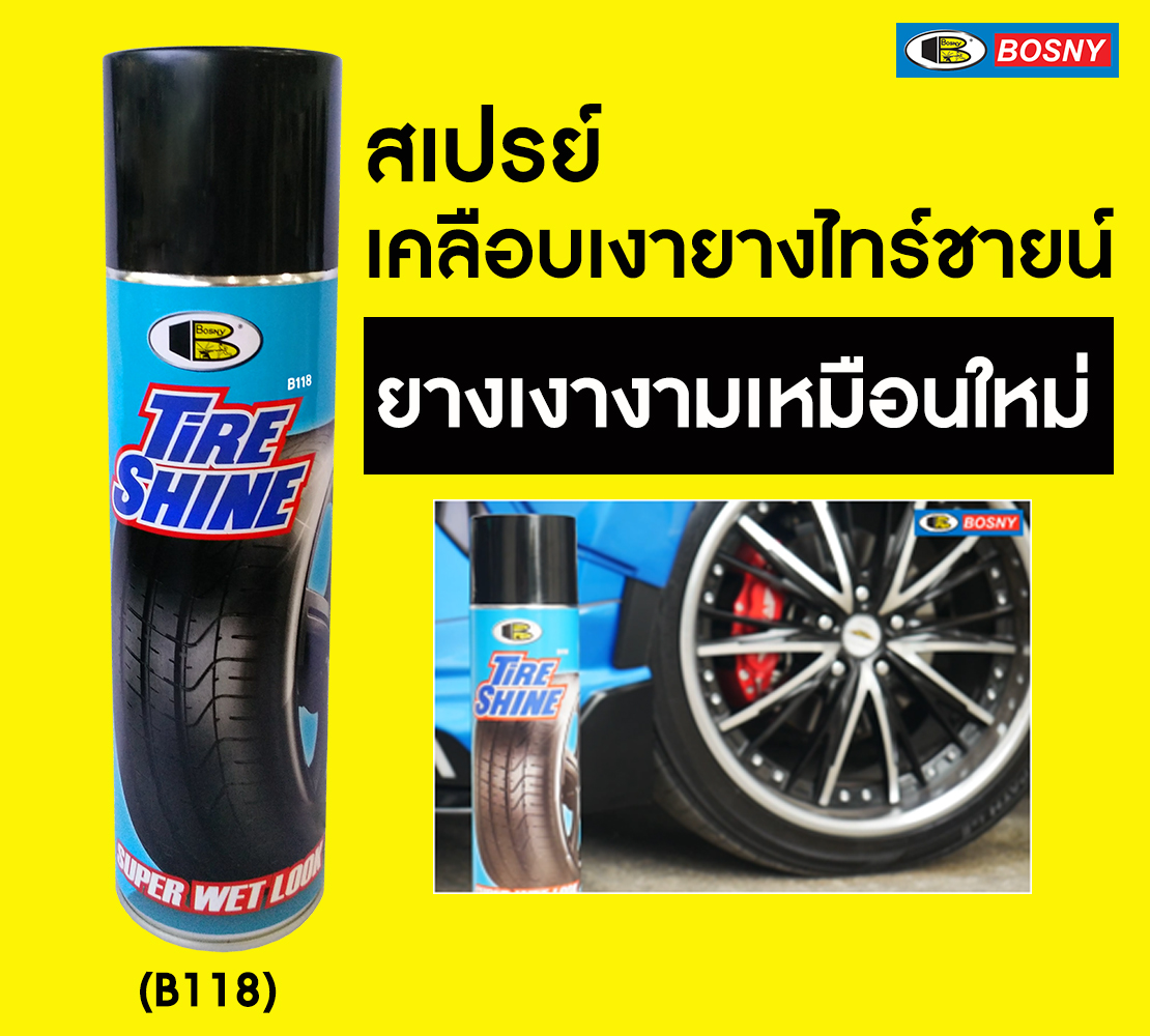Chai xịt bóng lốp xe, chai xịt bóng vỏ xe, chai xịt bóng ghế xe ô tô ,chai xịt bóng yên xe máy và bảo vệ lốp xe, vỏ xe, ghế xe và yên xe - TIRE SHINE Bosny B118 là sơn cao cấp được sản xuất tại Thái L...