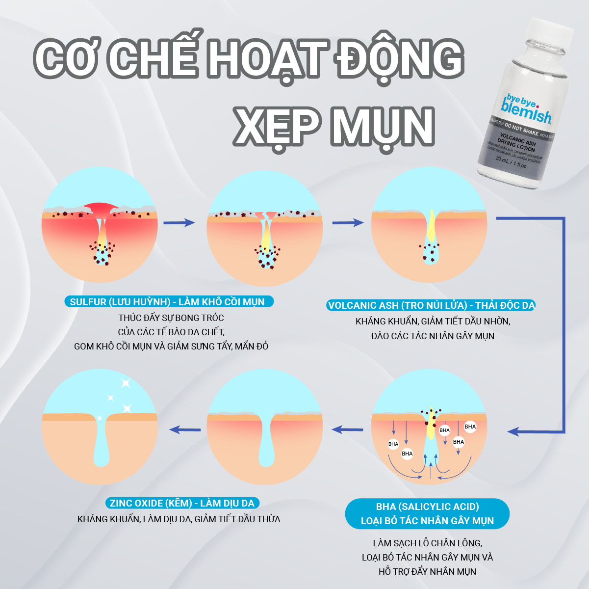 - Công thức giảm mụn của Bye Bye Blemish từ Acid Salicylic (hay còn gọi là BHA) với nồng độ 2%, kết hợp với Zinc Oxide 10% (Kẽm). Cho phép thẩm thấu sâu vào lỗ chân lông, làm khô cồi mụn tự nhiên và giúp dịu da. Nhập khẩu & Phân phối độc quyền bởi Công Ty Cổ Phần DNL Healthcare Group