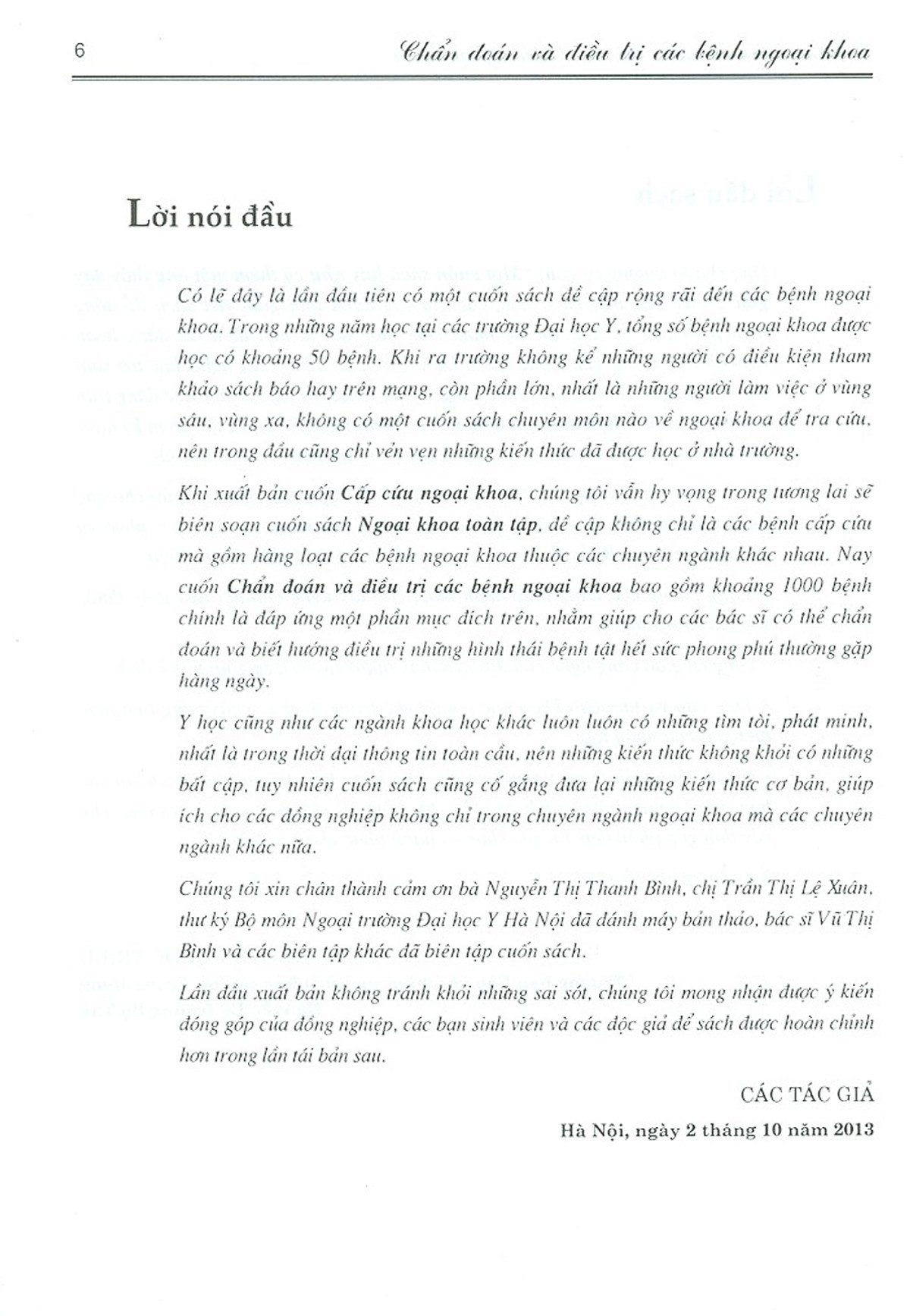 Chẩn đoán và điều trị các bệnh ngoại khoa Chủ biên: GS. Đặng Hanh Đệ Nhà xuất bản: Bộ Y Tế, NXB Giáo Dục Ngôn ngữ: Tiếng Việt Ngày xuất bản 09-2013 Loại bìa Bìa cứng Số trang 700 GIỚI THIỆU SÁCH Tác giả: GS. BS. Đặng Hanh Đệ ( chủ biên) ,cùng 27 tiến sĩ, thạc sĩ, PGS, BS các khoa Phẫu thuật tạo hình- hàm mặt, Khoa phẫu thuật tiêu hóa, khoa chấn thương chỉnh hình, Khoa gây mê hồi sức, Khoa phẫu thuật gan, Khoa phẫu thuật tiết niệu, Khoa phẫu thuật cấp cứu tiêu hóa, khoa phẫu thuật tim mạch và khôngg ngực Bệnh BỆNH VIỆN VIỆT ĐỨC lời giới thiệu, cuốn sách Chẩn đoán và ĐT các bệnh ngoại khoa là cuốn sách đã dược GS.TS.BS Đặng Hanh Đệ cùng các nhà giáo giàu kinh nghiệm của bộ môn ngoại Trường ĐH Y HN biên soạn theo đúng phương châm cung cấp kiến thức cơ bản, hệ thống, nội dung và thuật ngữ chính xác, cập nhật tiến bộ khoa học- kỹ thuật hiện đại của VN. Sách đã được hội đồng chuyên môn thành lập theo quyết định số: 2234/QĐ-BYT ngày 25/06/2013 của Bộ y tế thẩm định và đánh giá cao, được bộ y tế quyết định chính thức công nhận LÀ TÀI LIỆU DẠY-HỌC ĐẠT TIÊU CHUẨN CHUYÊN MÔN CỦA NGÀNH Y TẾ trong giai đoạn hiện nay. Cuốn sách với khoảng trên 1.000 bệnh được đề cập chắc chắn sẽ giúp cho các đồng nghiệp, nhất là ở các tuyến cơ sở, vùng sâu vùng xa tăng cường khả năng thực hành nâng tao cay nghê; chuyển giao công nghệ của đội ngũ thầy thuốc tuyến trên giúp tuyến dướ