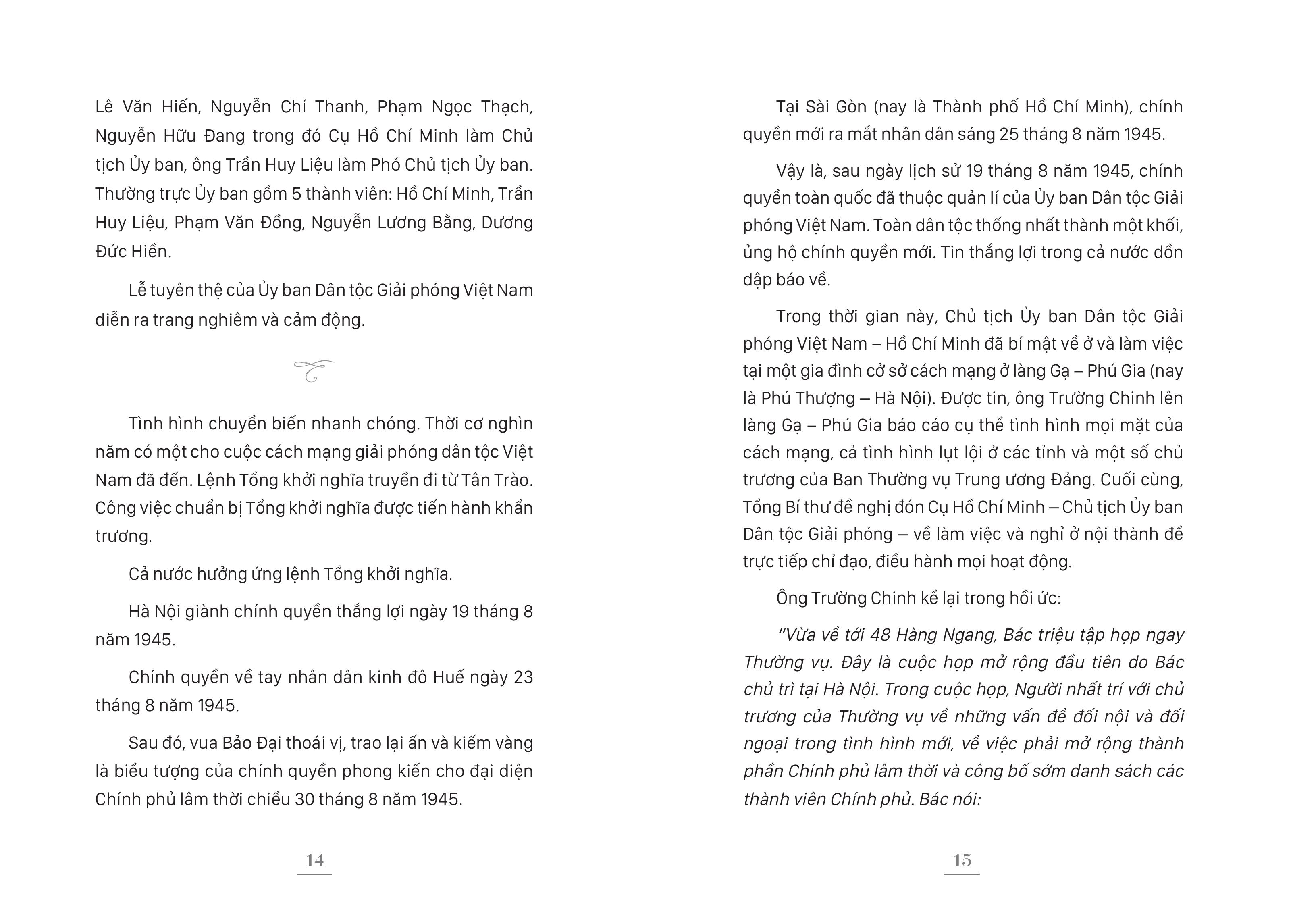 Ngày 28 tháng 8 năm 1945, danh sách các vị Bộ trưởng của Chính phủ tương lai ấy đã hoàn thiện. Những người được lựa chọn trở thành Bộ trưởng là những nhân vật có trình độ, kiến thức, phẩm cách, tình yêu nước, chung sức, chung lòng vì nền độc lập của nước nhà. Họ gồm 15 người, chiều ngày mùng 2 tháng 9 năm 1945, tại lễ Tuyên ngôn Độc lập khai sinh nước Việt Nam Dân chủ Cộng hòa, đã đứng bên nhau trên lễ đài, trước quốc dân đồng bào, trước đất trời sông núi linh thiêng cất lên lời thề phụng sự Tổ quốc và nhân dân.