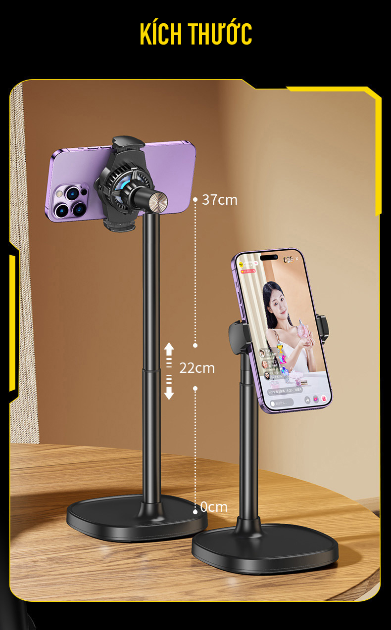 - Chân livestream điện thoại có đế làm lạnh giúp làm mát điện thoại khi livestream lâu