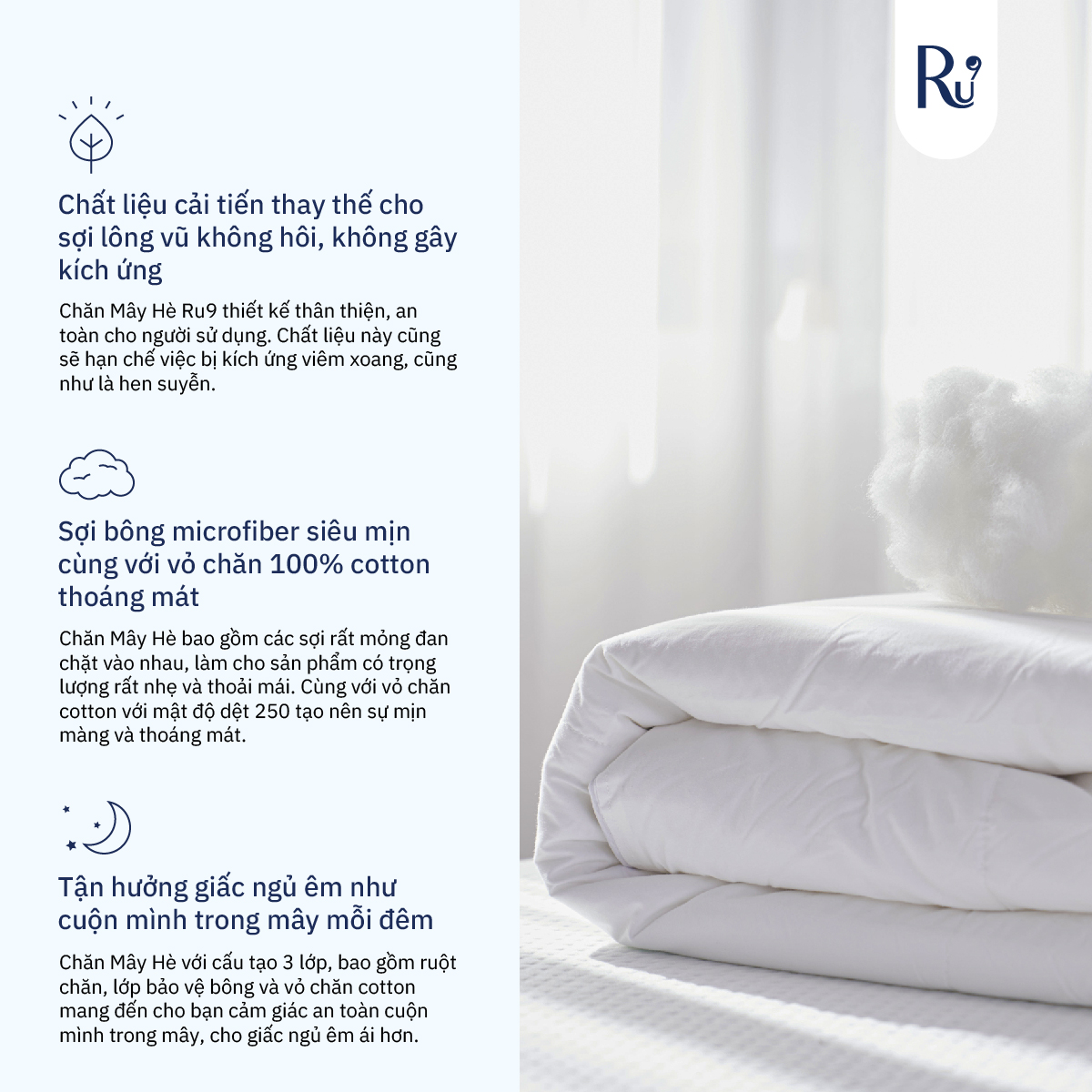 - Thông tin sản phẩm: Chăn Mây Hè với trọng lượng nhẹ và thoải mái, cùng độ mềm mịn tối ưu từ chất liệu sợi bông siêu mịn Microfiber, thân thiện với người sử dụng, giúp bạn như được cuộn mình trong mây mỗi đêm, êm ái, thoáng mát và dễ chịu.