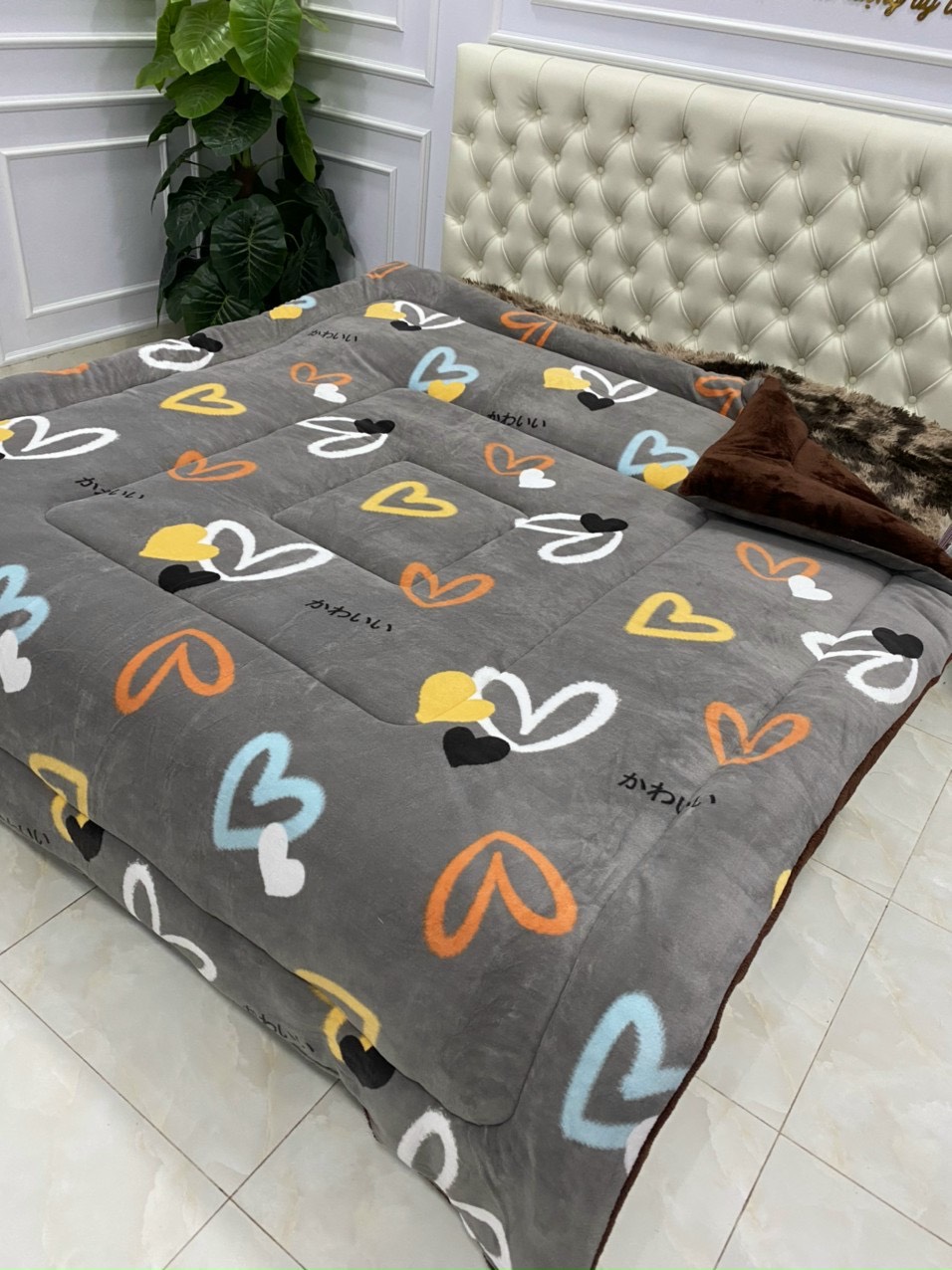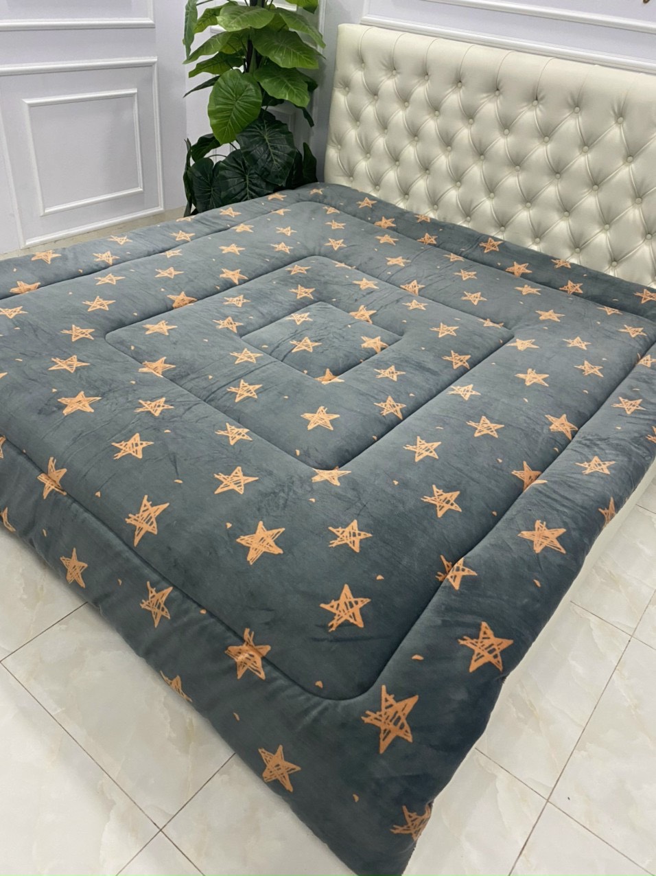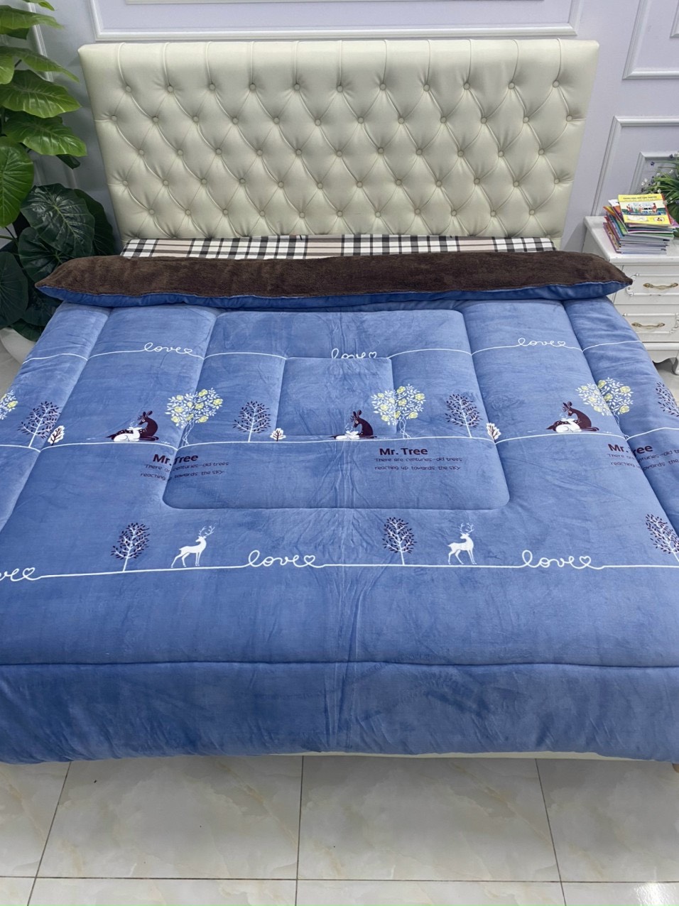 Size Queen 248x233cm chuẩn Âu – rộng rãi, ôm trọn giấc ngủ. • Trọng lượng ~2.2kg – siêu nhẹ, siêu êm, cực ấm. • Bề mặt nhung mịn, dày, không bám lông – chạm vào