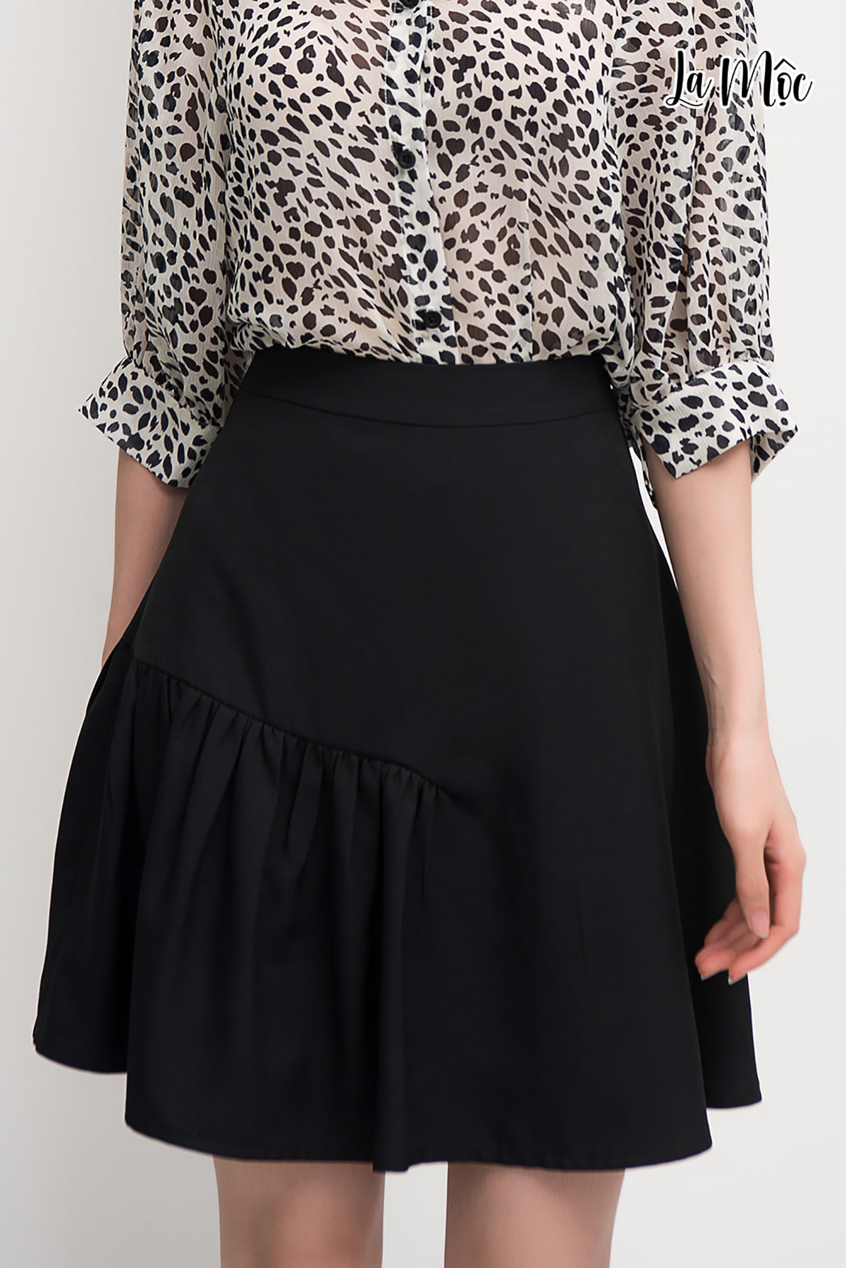 Váy đen nhún La Mộc với chất liệu xoa lụa Korea tạo cảm giác mềm mại. Thiết kế nhún phần hông trước và sau góp phần tôn dáng của nàng. Thiết kế dành riêng cho