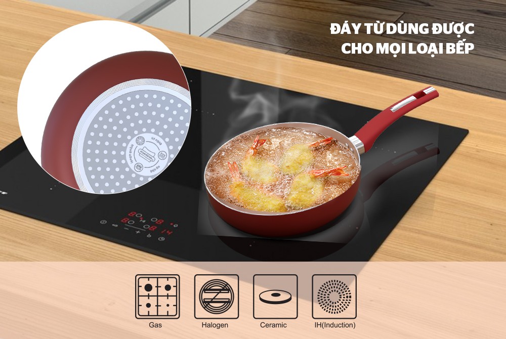 Làm bằng thép từ tính kết hợp lõi nhôm dày 6mm Lòng chảo được phủ lớp chống dính cao cấp Chảo được thiết kế kết cấu chống trơn trượt dưới đáy, rất an toàn khi