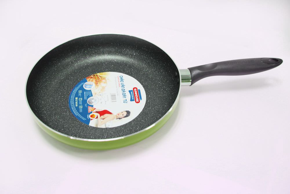 Làm bằng thép từ tính kết hợp lõi nhôm dày 6mm Lòng chảo được phủ lớp chống dính cao cấp Chảo được thiết kế kết cấu chống trơn trượt dưới đáy, rất an toàn khi