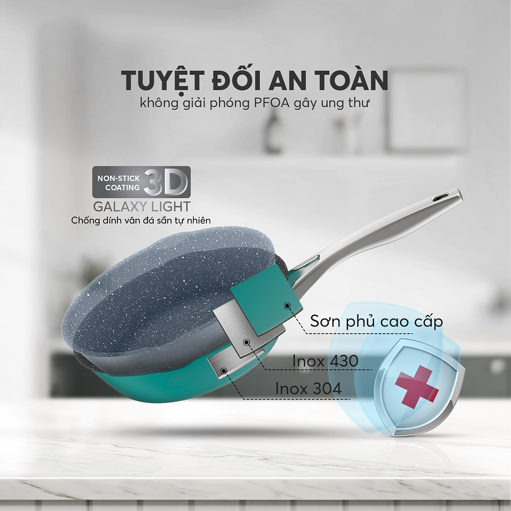 Là một chiếc chảo lòng cực rộng; dùng được đa năng như chiên, xào, nướng. Rất thích hợp làm BBQ. Chảo có hoạ tiết Blakcube được phủ lớp chống dính gốm màu ngọc xanh của