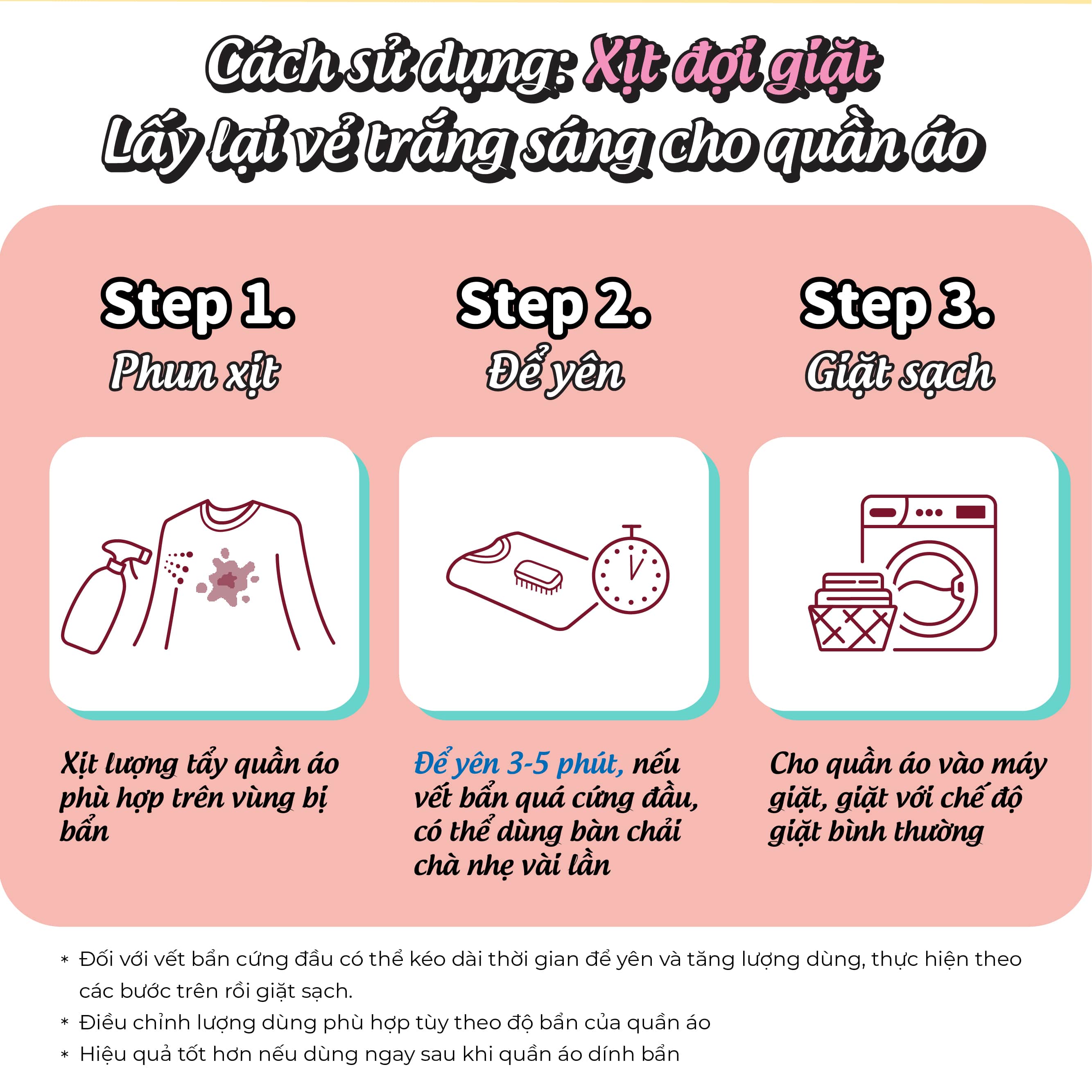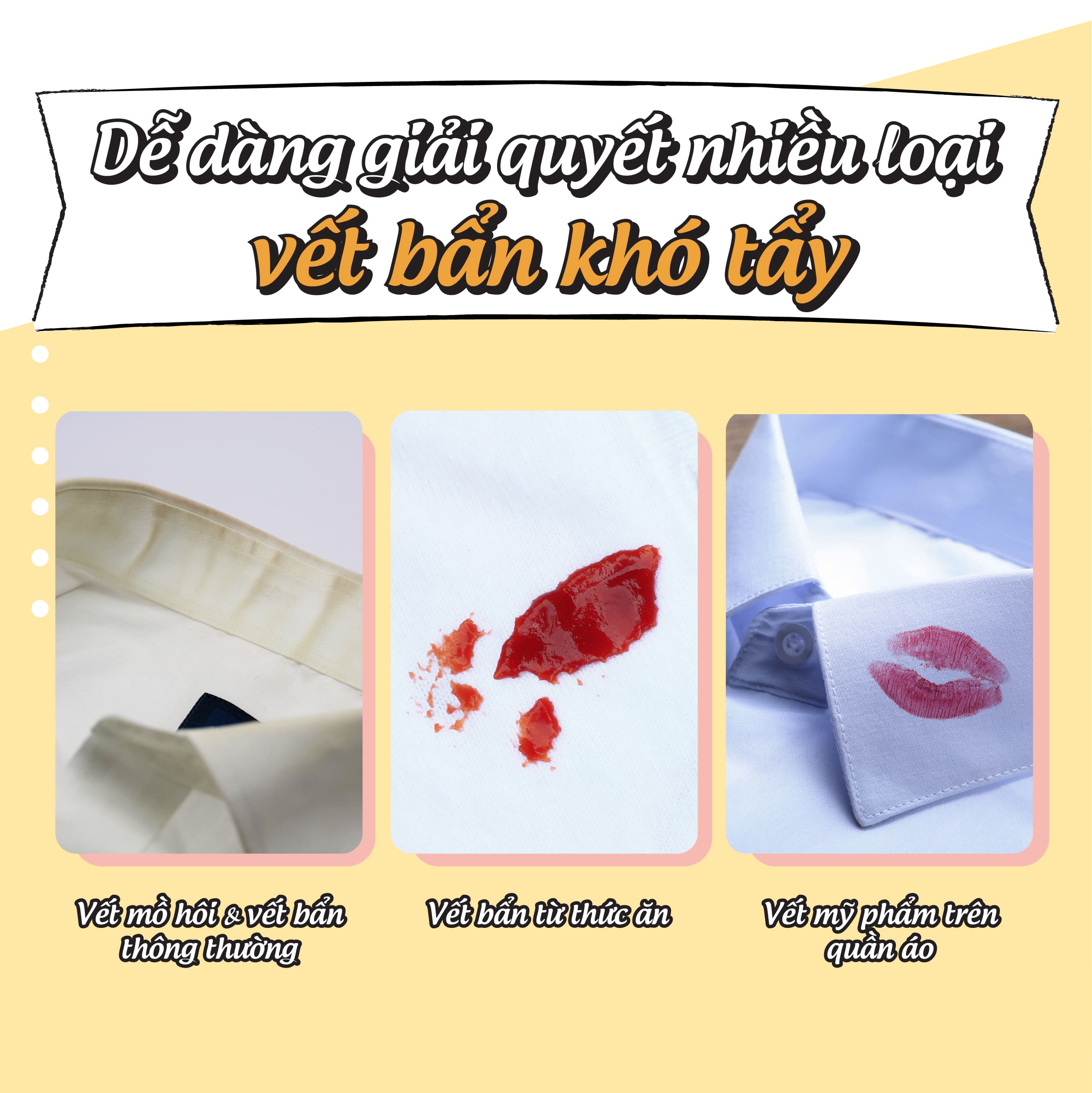 - Làm sạch các vết bẩn thông thường, vết mồ hôi: tẩy sạch các vết bẩn, vết mồ hôi, nước tiểu, vết máu trên quần áo, cổ áo, tay áo, nách áo, ống quần, quần áo lót
