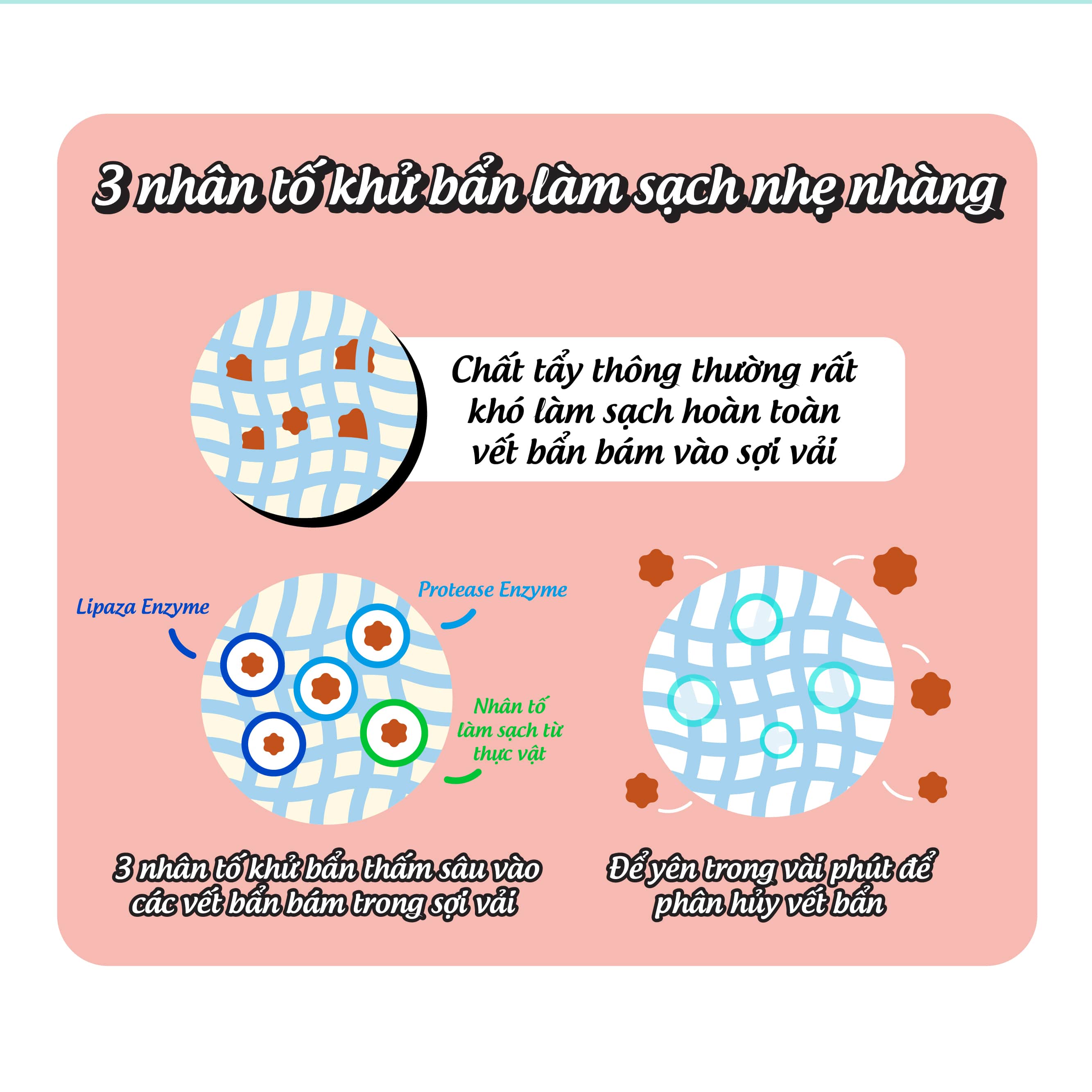 - Làm sạch các vết bẩn thức ăn: tẩy sạch các vết bẩn thức ăn bám trên quần áo như vết sữa, cà phê, trà, dầu mỡ, tương, trái cây, rượu,...