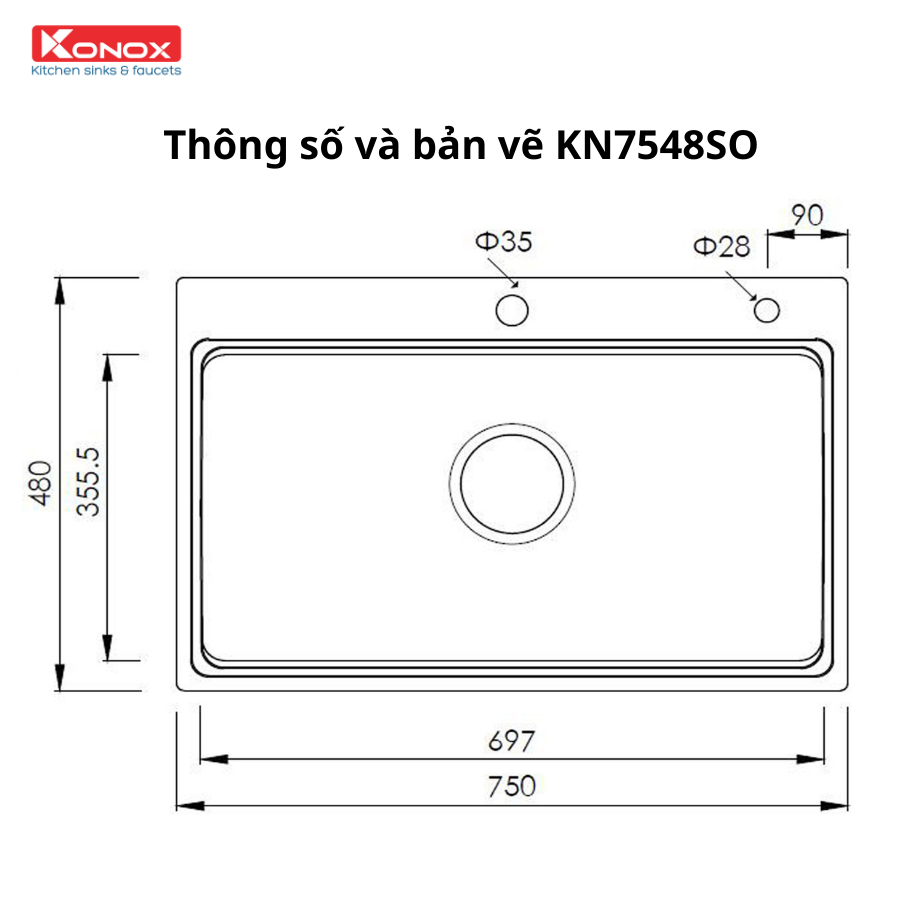 Mã sản phẩm: KN7548SO Kích thước (mm): 750480230 Kích thước hố (mm):  697356 Cắt đá (mm): 730460 Độ dày (mm): 1.0 Chất liệu: SS304 Full set kèm Siphon, colander