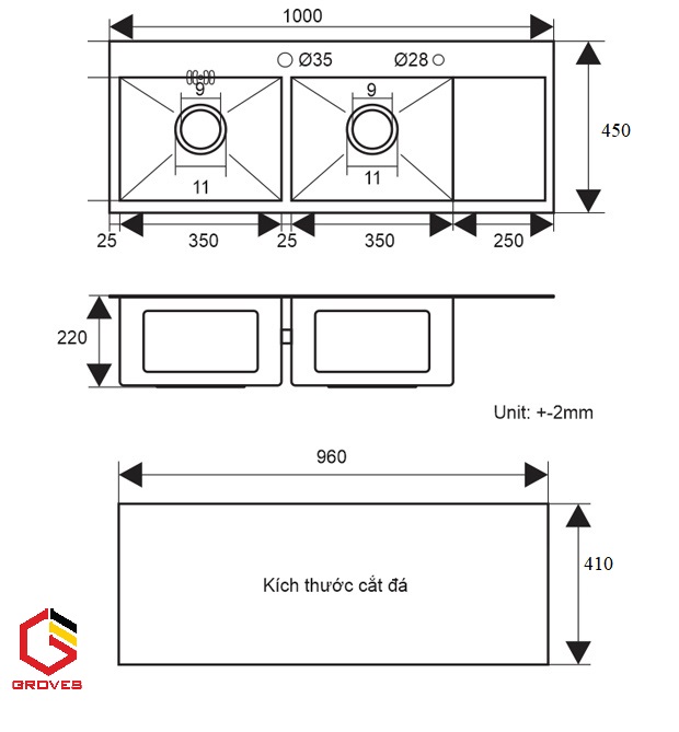 Kích thước: 1000x480x230mm Khoét lỗ: 980x460mm Chất liệu: Inox 304