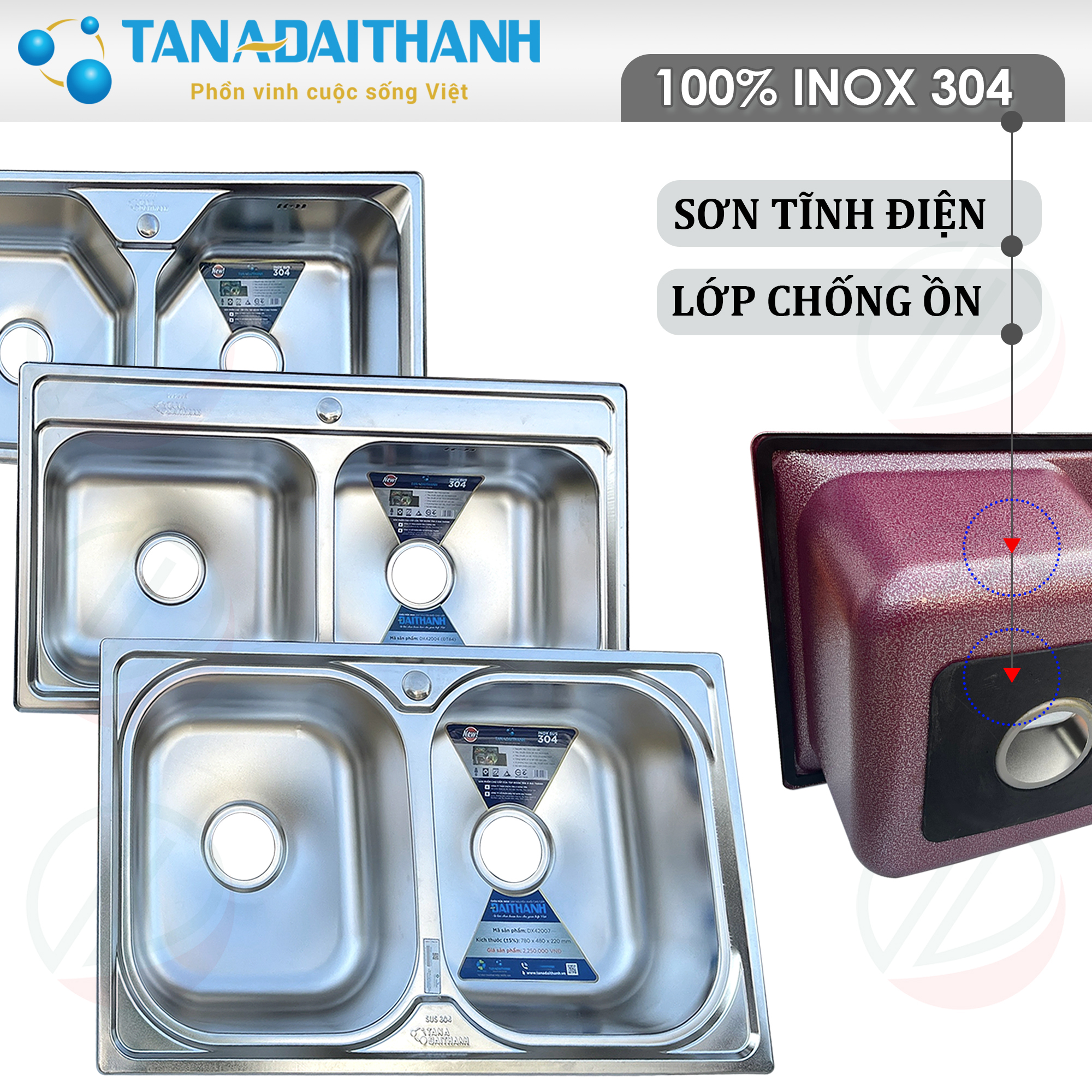 Chậu Rửa Chén Bát Tân Á Đại Thành Inox SUS304 Loại 2 Hộc, gồm 3 mẫu với 3 kích thước sau: