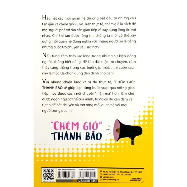 Với những chiến lược và ví dụ thực tế, “Chém gió” thành bão sẽ giúp bạn từng bước vượt qua nỗi sợ giao tiếp, học được cách nói chuyện “mặn mà” hơn, làm chủ được ngôn ngữ cơ thể của mình, từ đó có đủ can đảm và tự tin để bắt chuyện và mở rộng mối quan hệ với mọi người xung quanh.