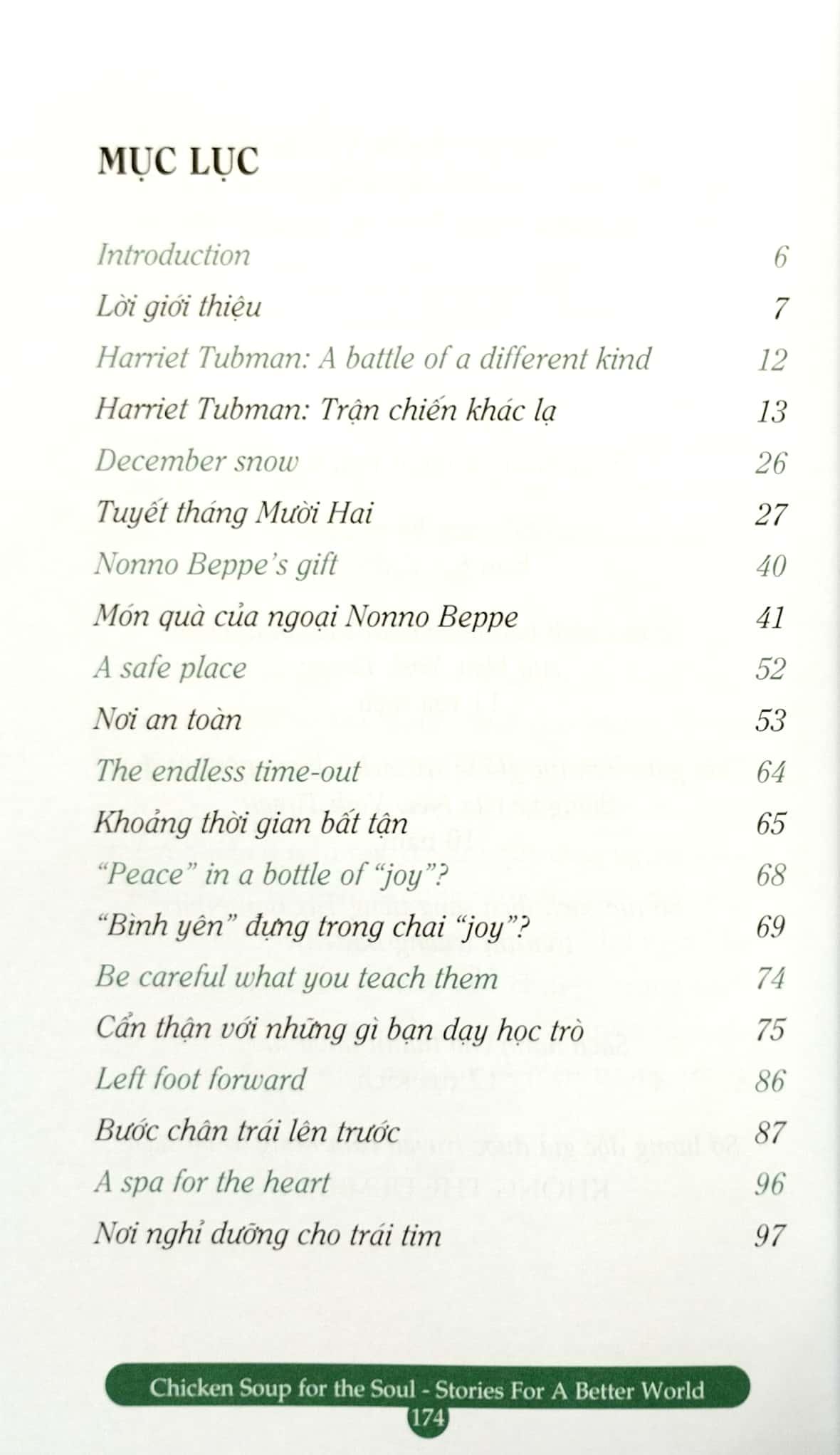 Mong rằng bạn sẽ dành ra chút thời gian nghĩ lại về những câu chuyện đã tác động tích cực đến bạn – dù bạn đọc trong sách của chúng tôi hay trong những cuốn sách khác, hay chính bạn gặp phải trong cuộc sống – và hồi tưởng lại cảm giác phấn khích tuyệt vời bạn đã có khi lần đầu tiên cảm nhận. Những câu chuyện trong Chicken Soup for the Soul Stories for a Better World – Tin vào ngày mai truyền cảm hứng và chia sẻ niềm vui trong cuộc sống, về niềm tin vào những điều tốt đẹp, bất kể những khó khăn trước mắt.